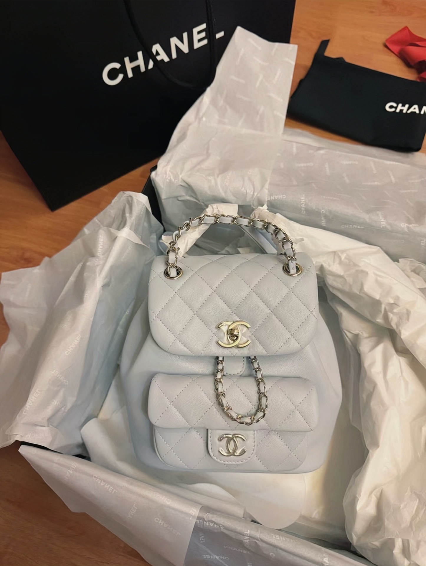 NO:1215972. The backpack is from Chanel designer.