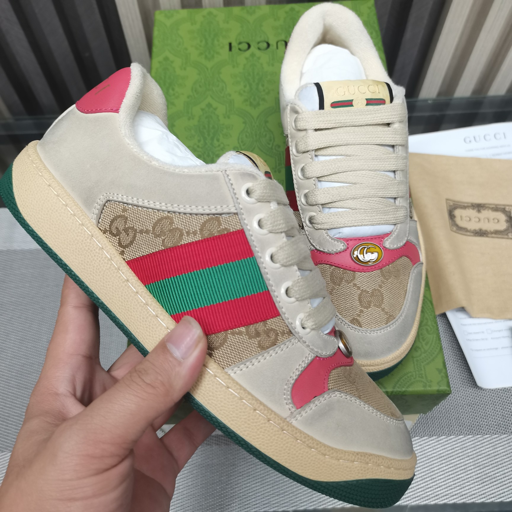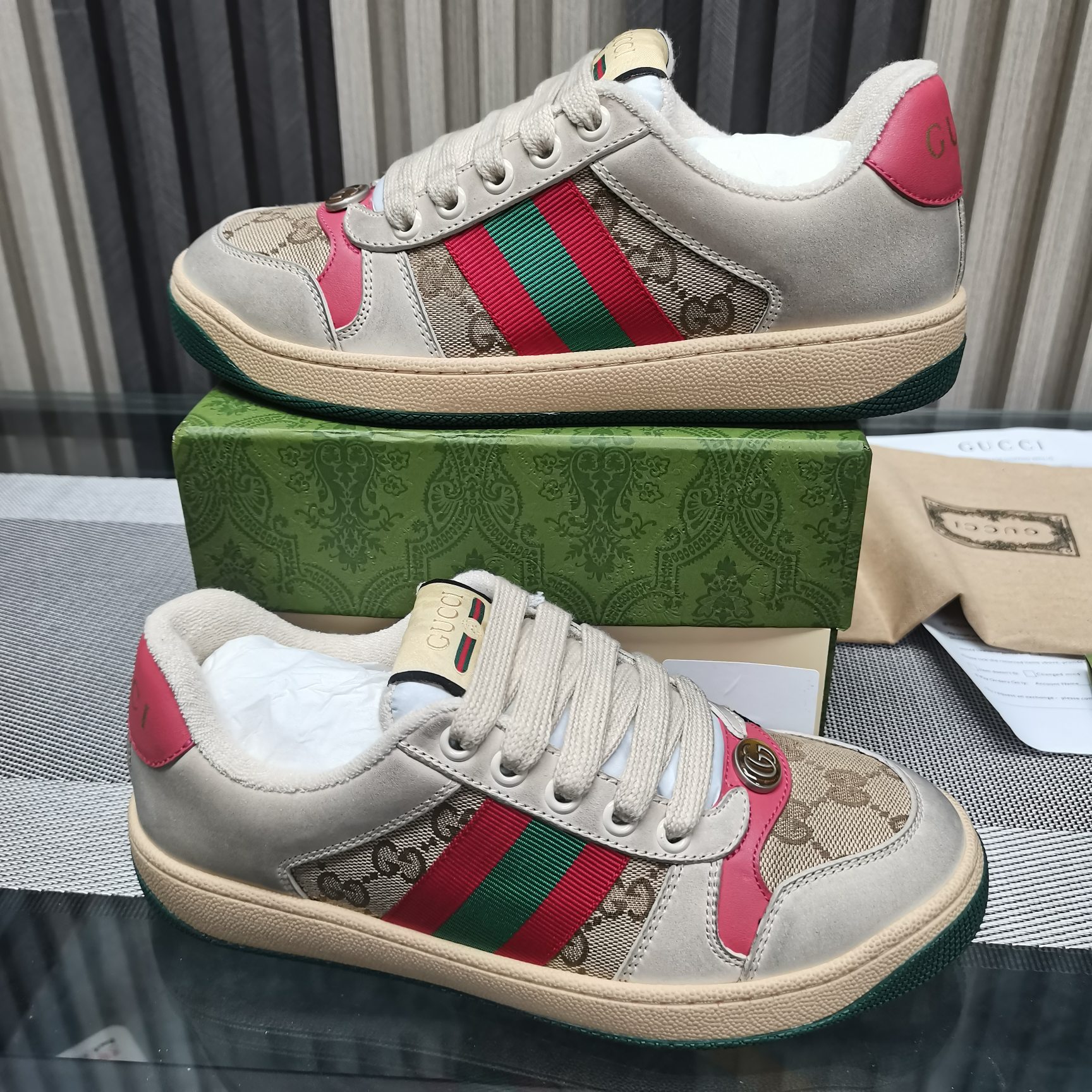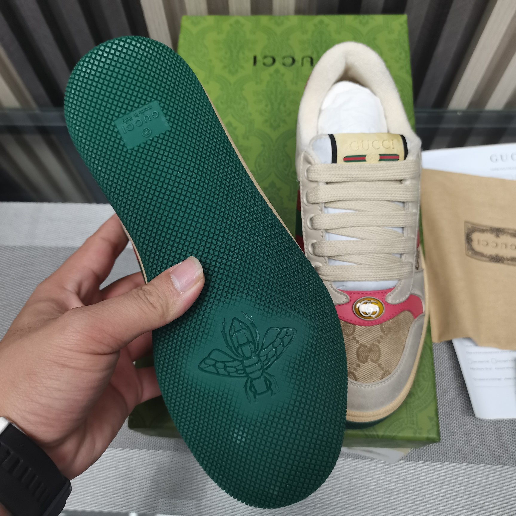 This shoes is AAAAA 1:1 quality (superb). Materials used are identical to the original ones. Gucci trademark marks are indistinguishable to the authentic. Photos take by actual shoes, what you receive will be 100% same with our photos.