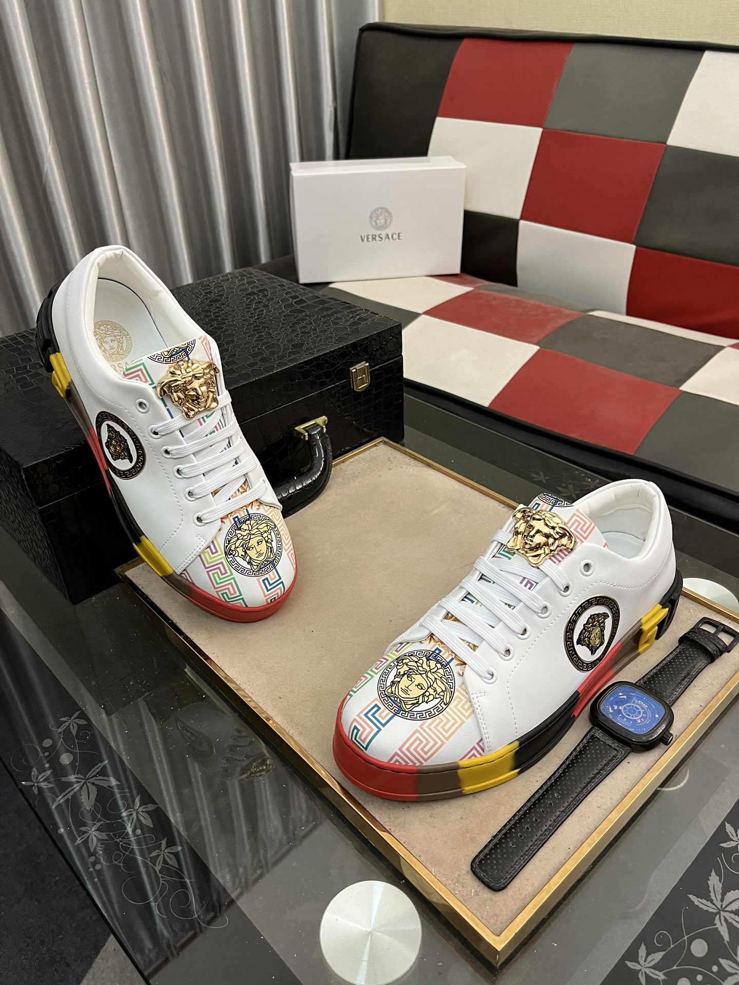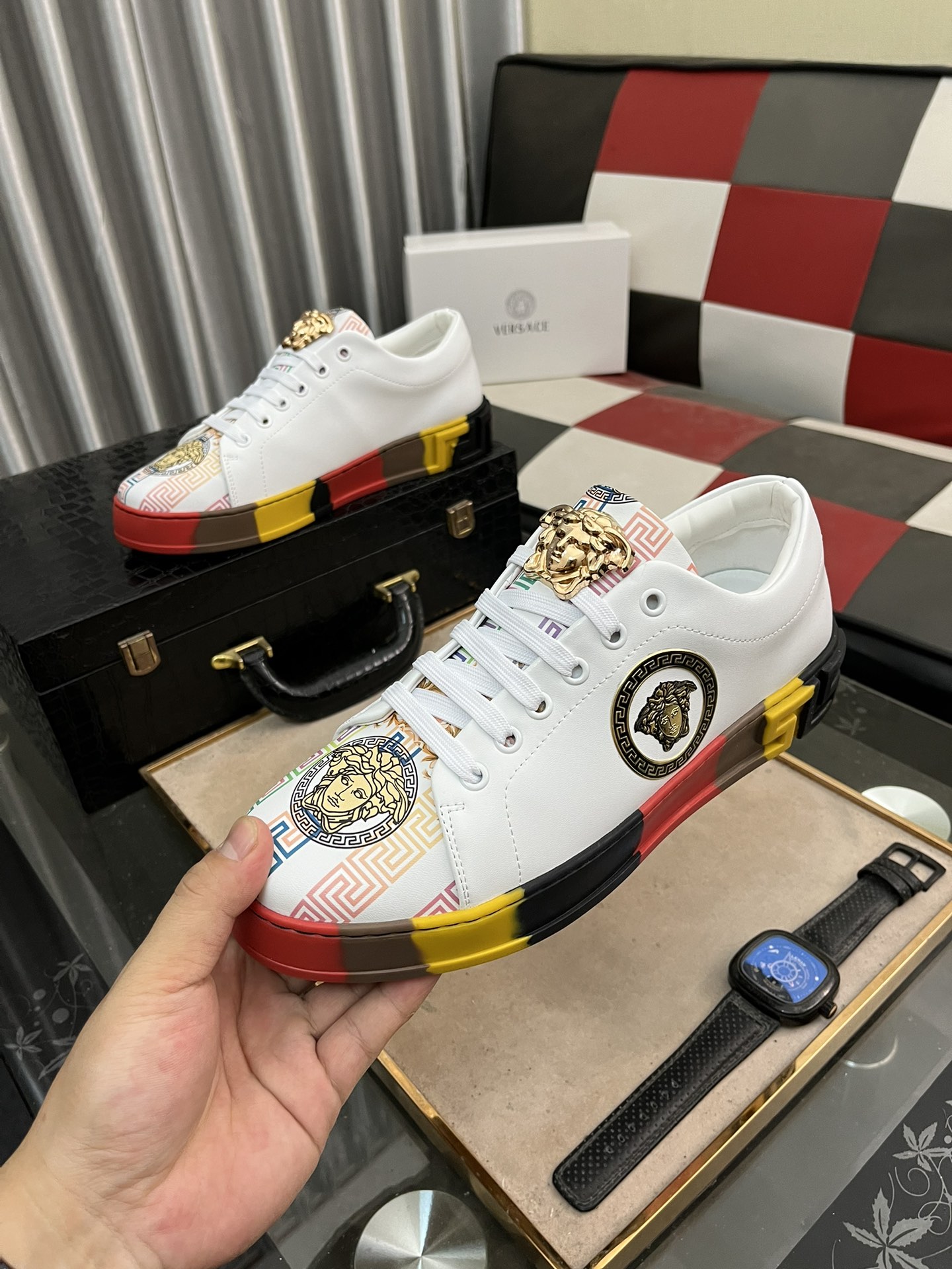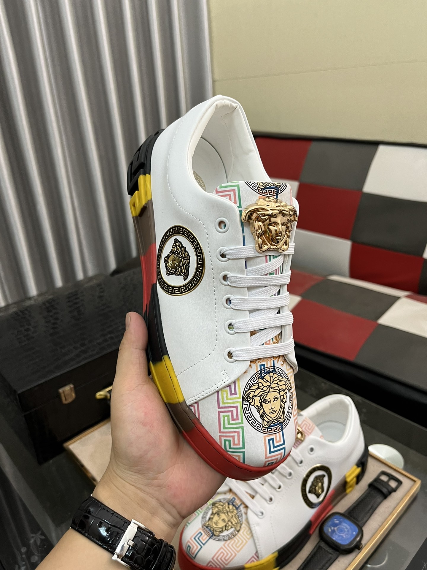 This shoes is AAAAA 1:1 quality (superb). Materials used are identical to the original ones. Versace trademark marks are indistinguishable to the authentic. Photos take by actual shoes, what you receive will be 100% same with our photos.