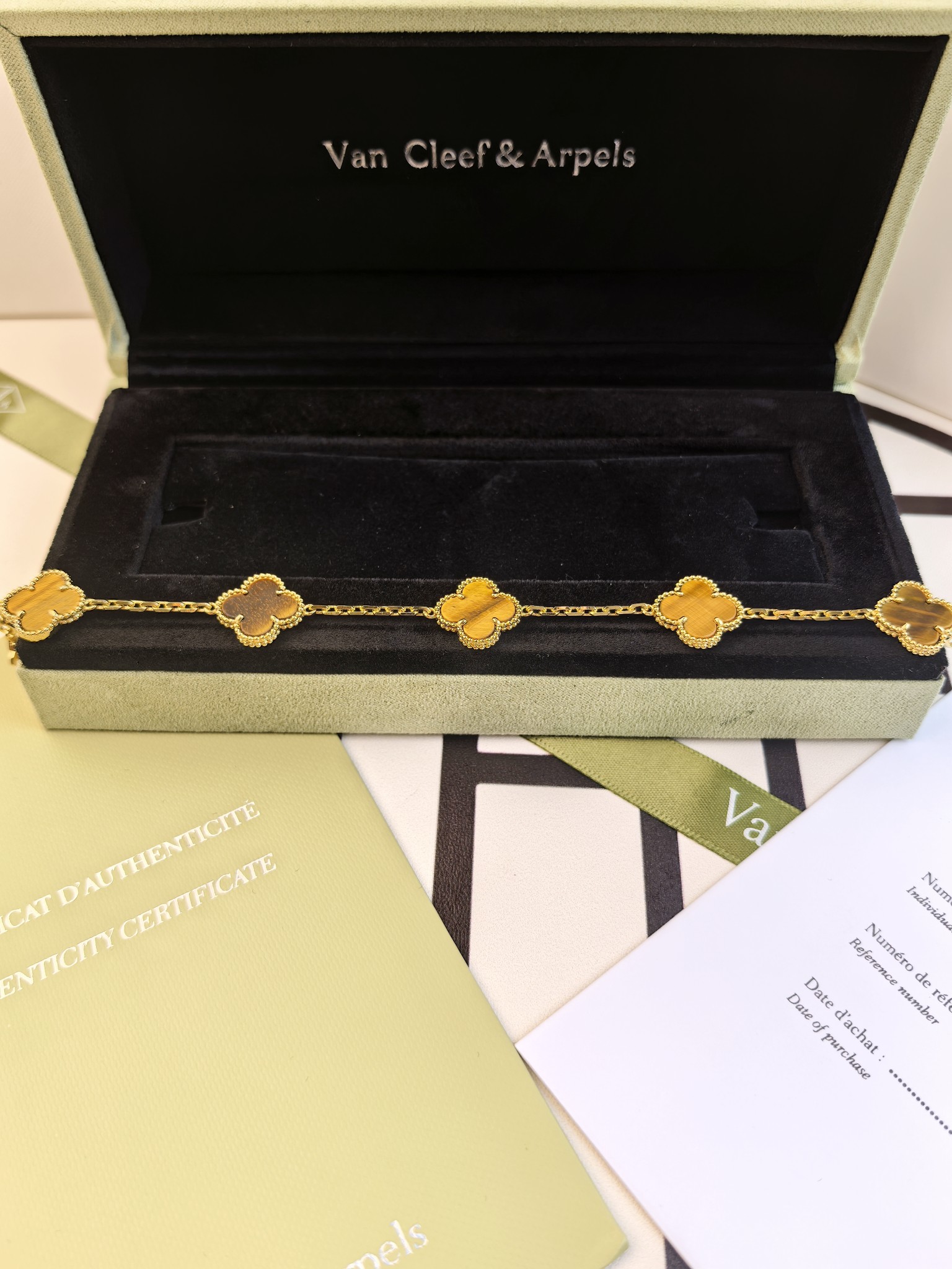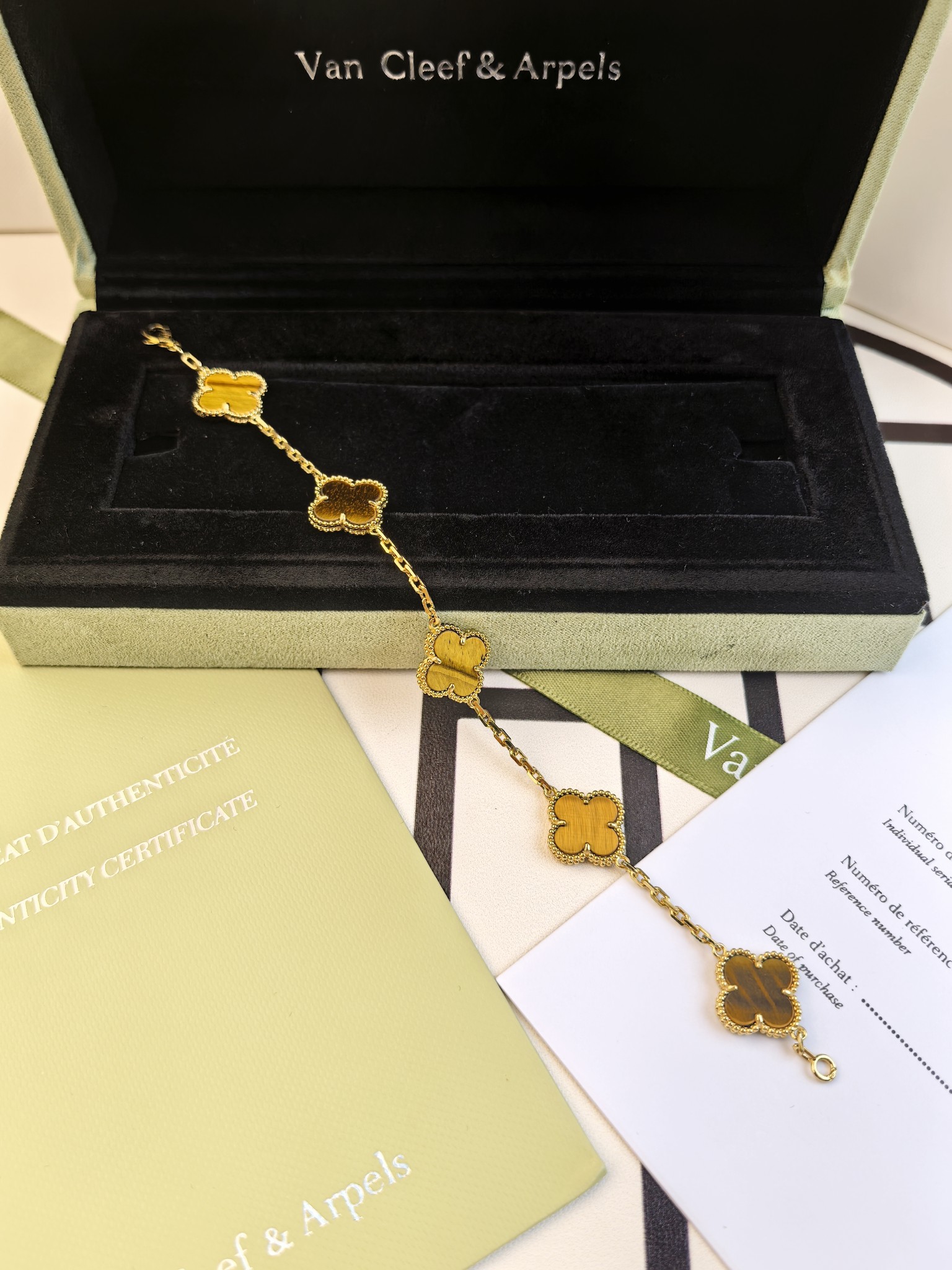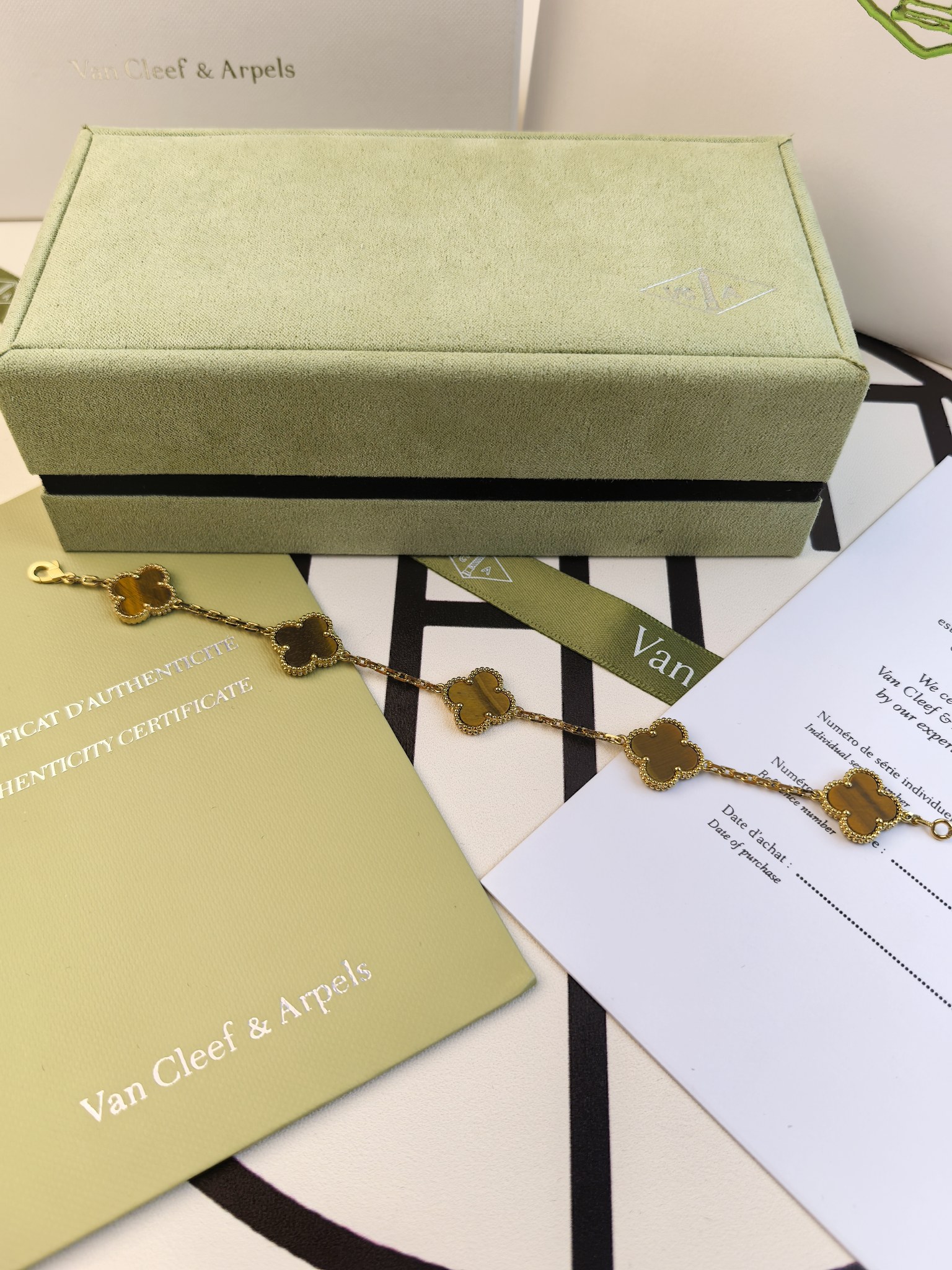 This jewelry is AAAAA 1:1 quality (superb). Materials used are identical to the original ones. Van Cleef & Arpels trademark marks are indistinguishable to the authentic. Photos take by actual jewelry, what you receive will be 100% same with our photos.