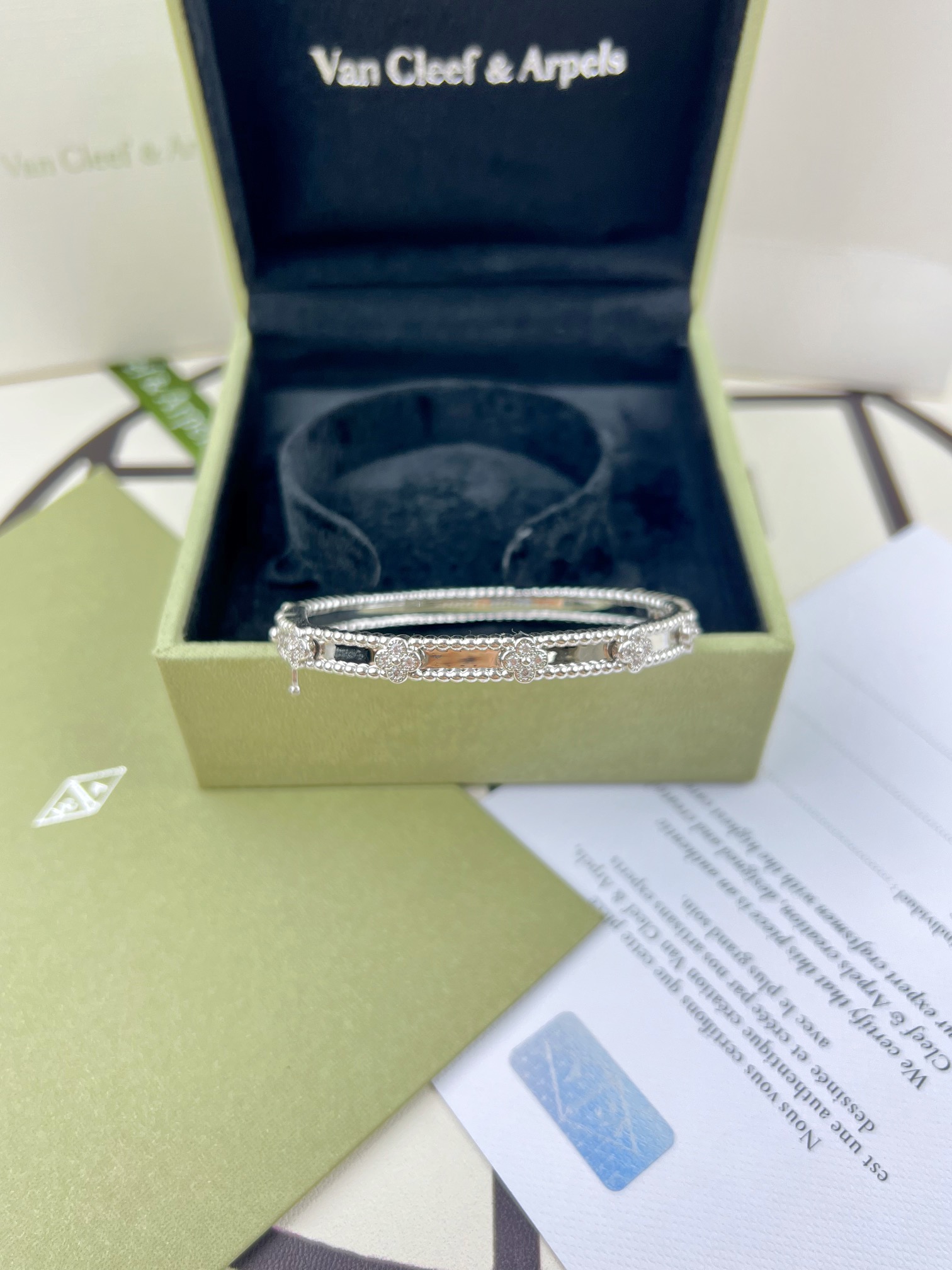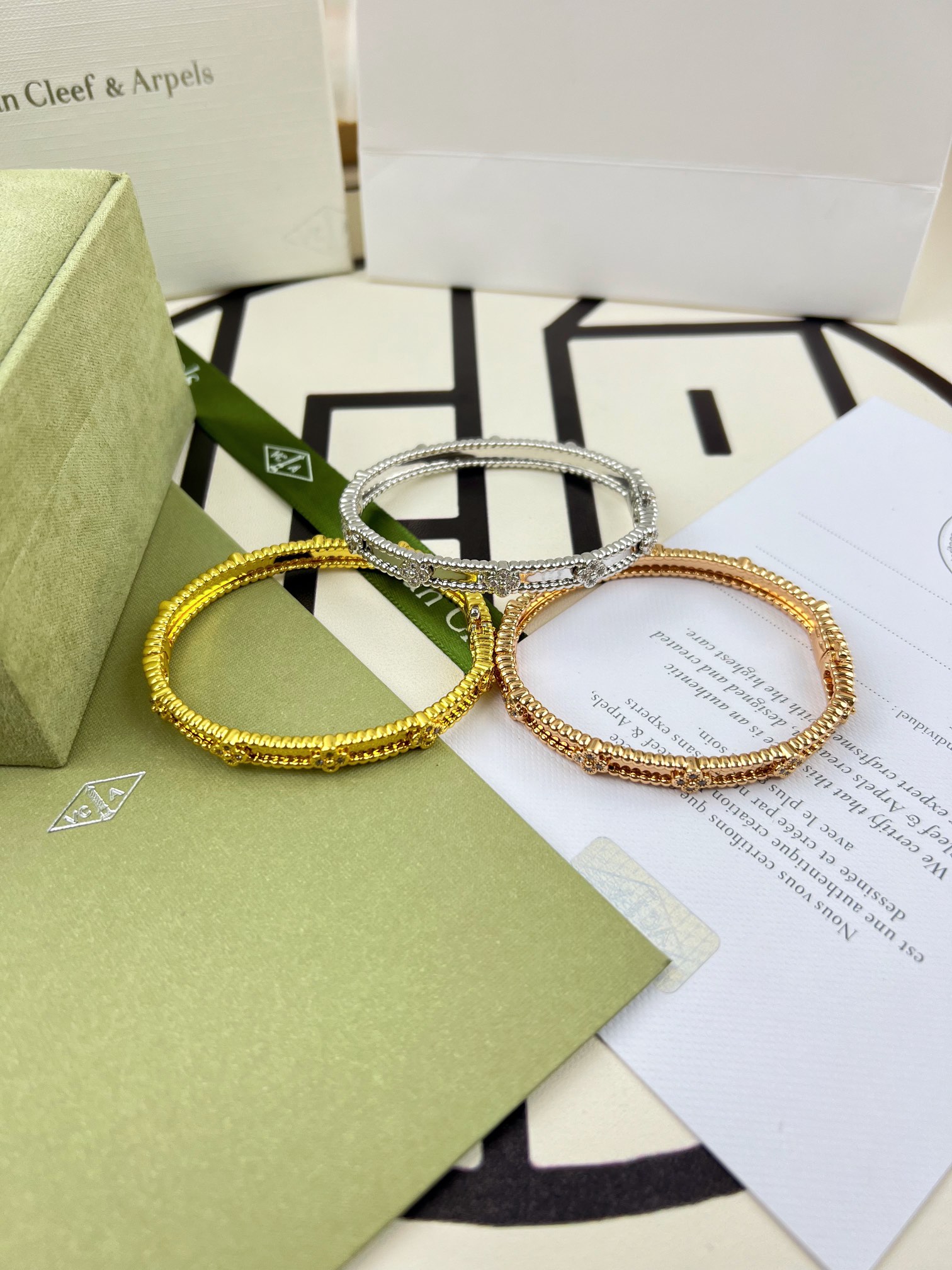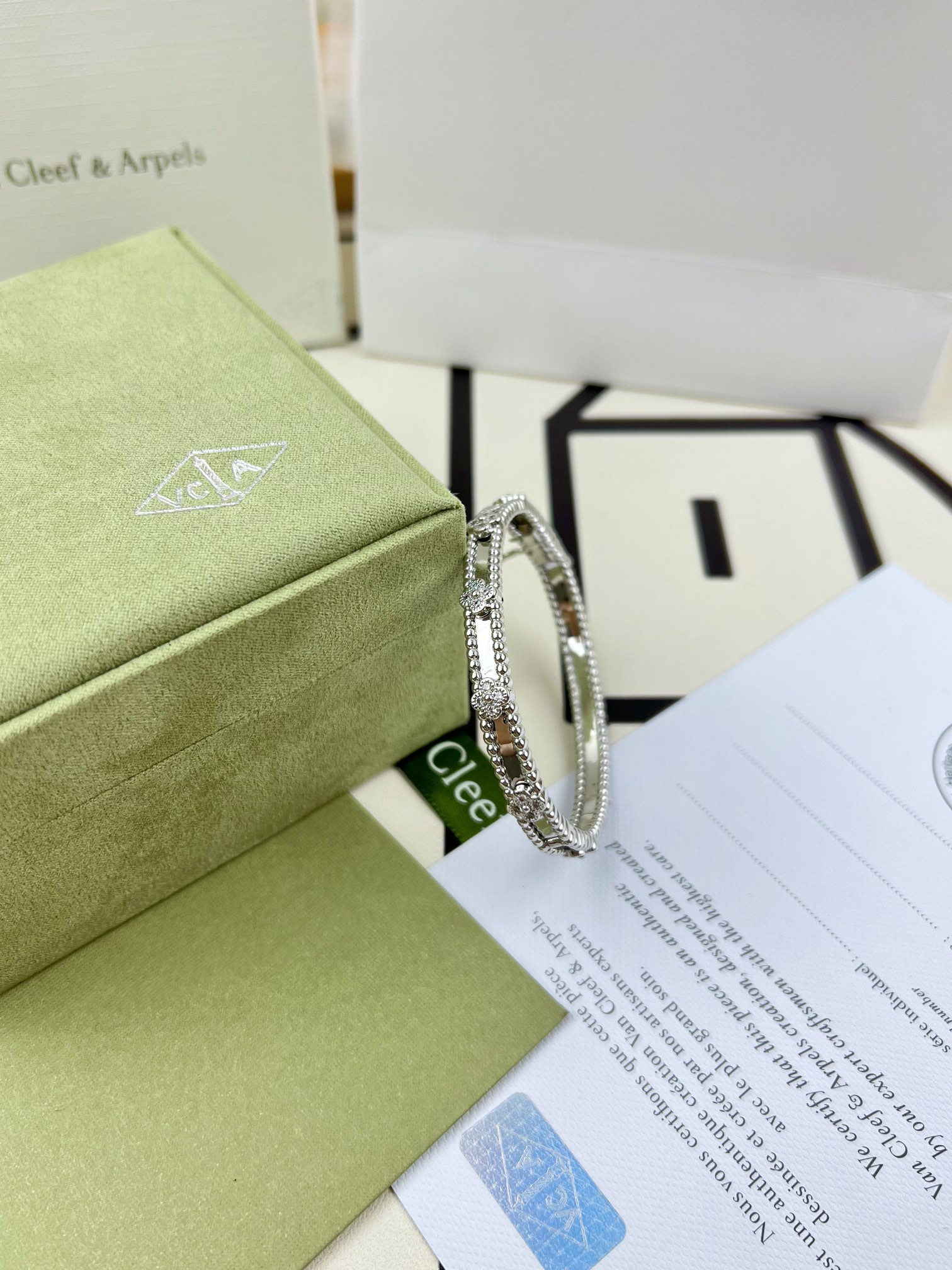 This jewelry is AAAAA 1:1 quality (superb). Materials used are identical to the original ones. Van Cleef & Arpels trademark marks are indistinguishable to the authentic. Photos take by actual jewelry, what you receive will be 100% same with our photos.