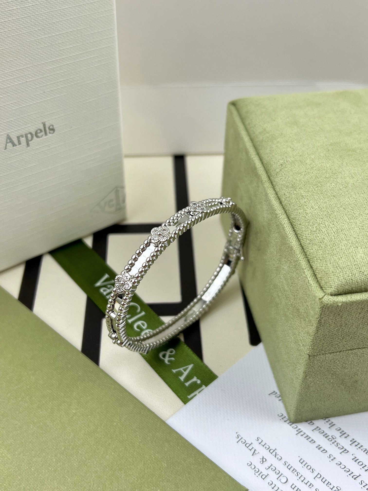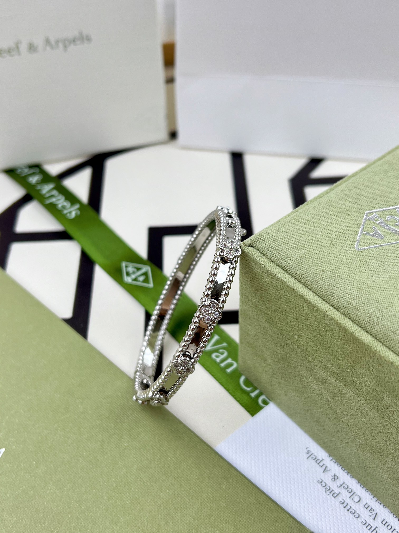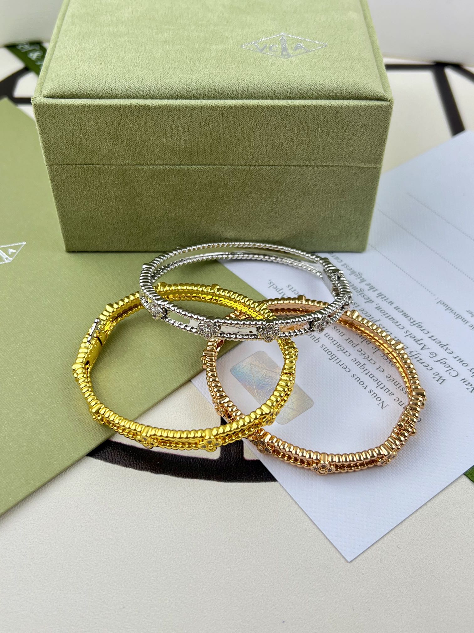This jewelry is AAAAA 1:1 quality (superb). Materials used are identical to the original ones. Van Cleef & Arpels trademark marks are indistinguishable to the authentic. Photos take by actual jewelry, what you receive will be 100% same with our photos.