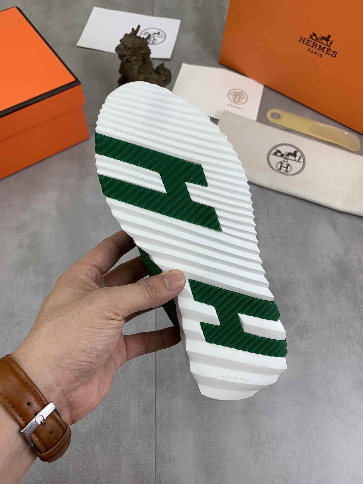 This shoes is AAAAA 1:1 quality (superb). Materials used are identical to the original ones. Hermes trademark marks are indistinguishable to the authentic. Photos take by actual shoes, what you receive will be 100% same with our photos.