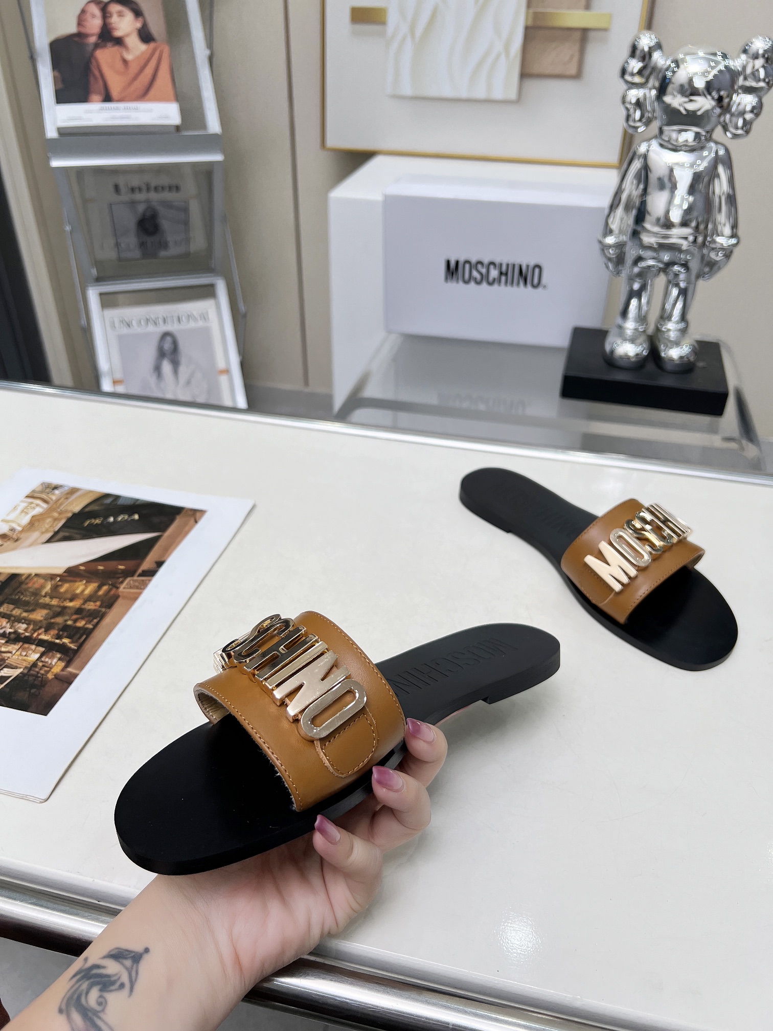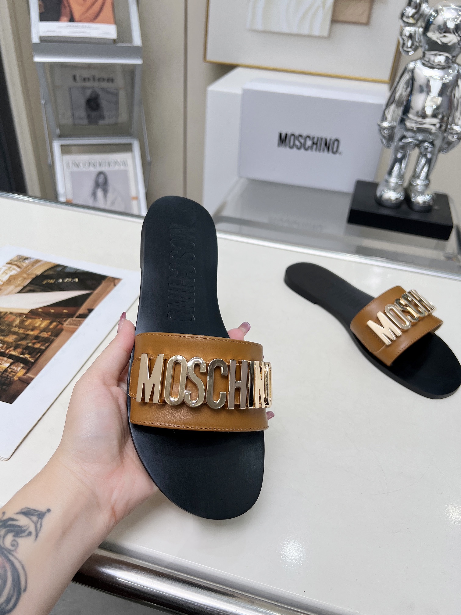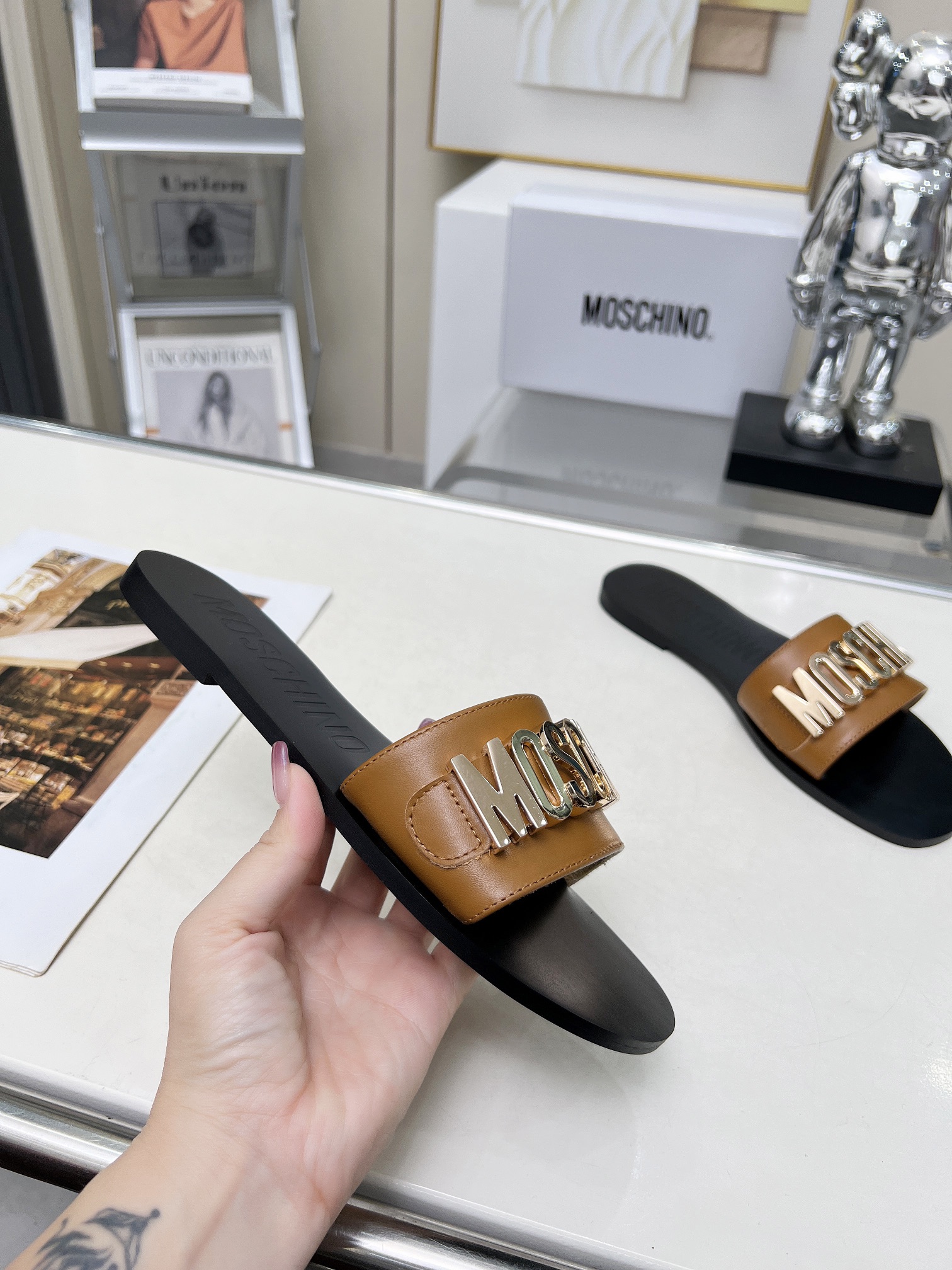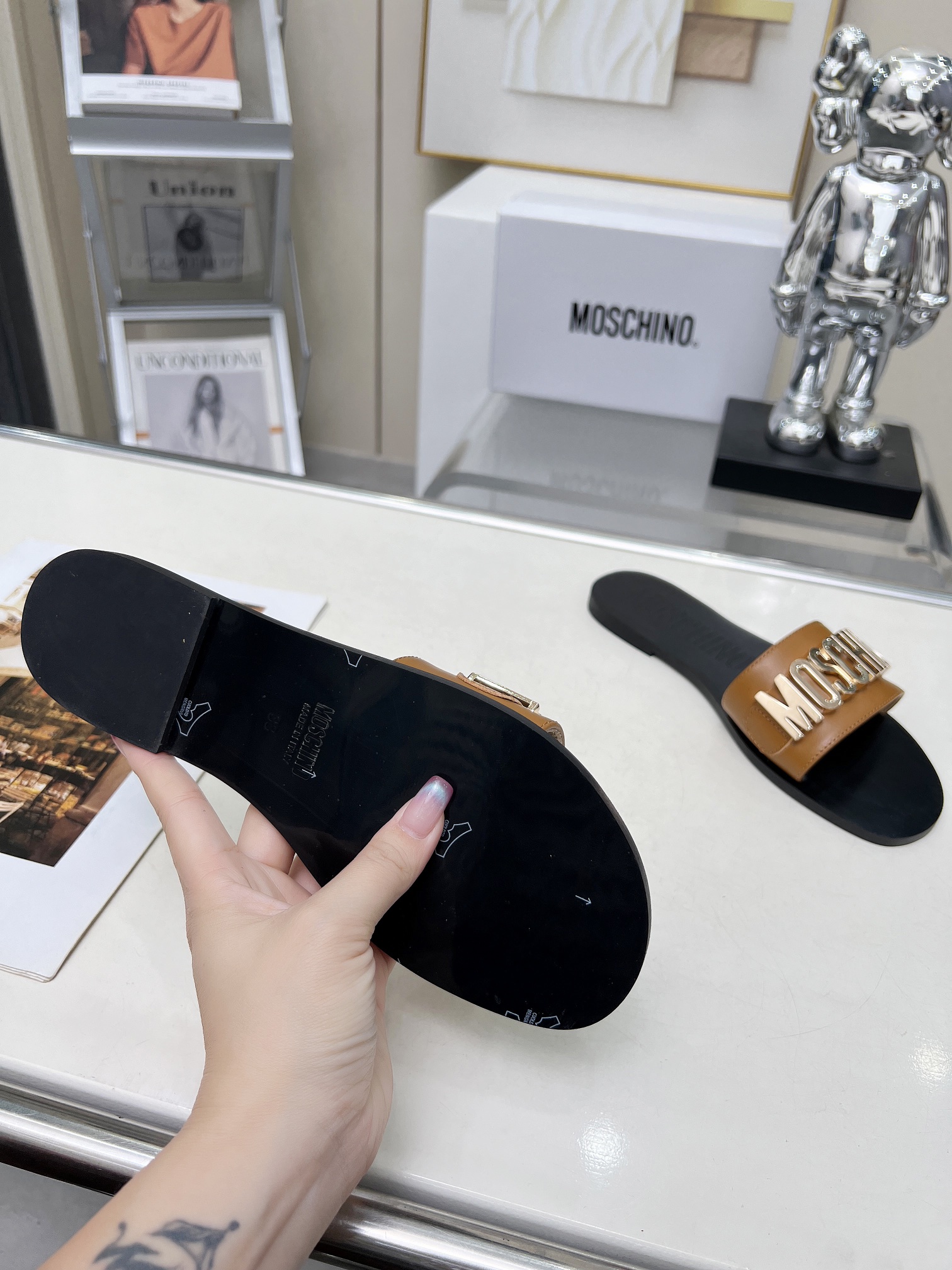 This shoes is AAAAA 1:1 quality (superb). Materials used are identical to the original ones. Moschino trademark marks are indistinguishable to the authentic. Photos take by actual shoes, what you receive will be 100% same with our photos.