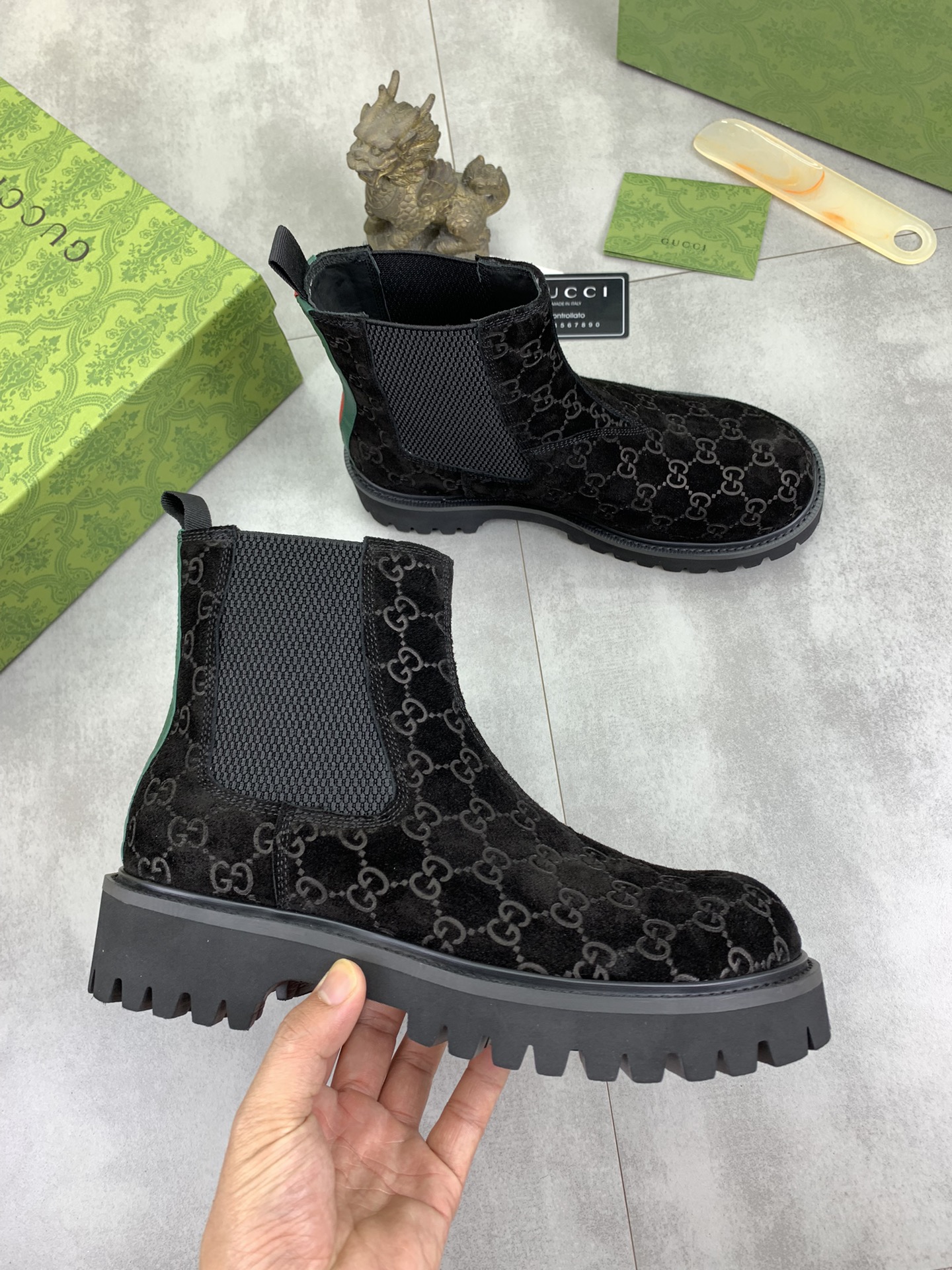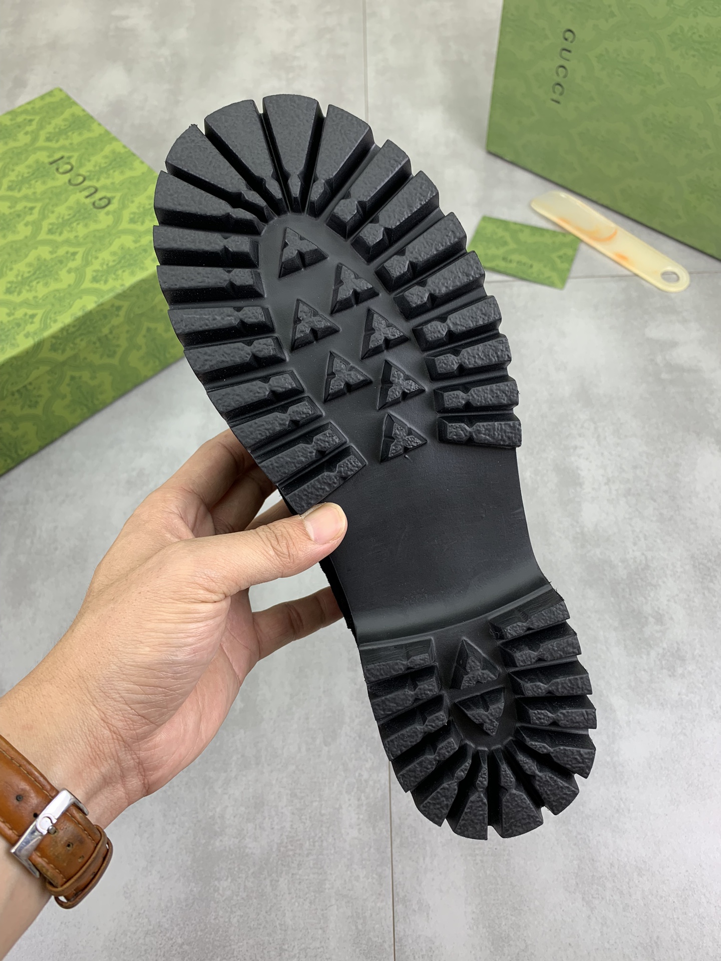 This shoes is AAAAA 1:1 quality (superb). Materials used are identical to the original ones. Gucci trademark marks are indistinguishable to the authentic. Photos take by actual shoes, what you receive will be 100% same with our photos.