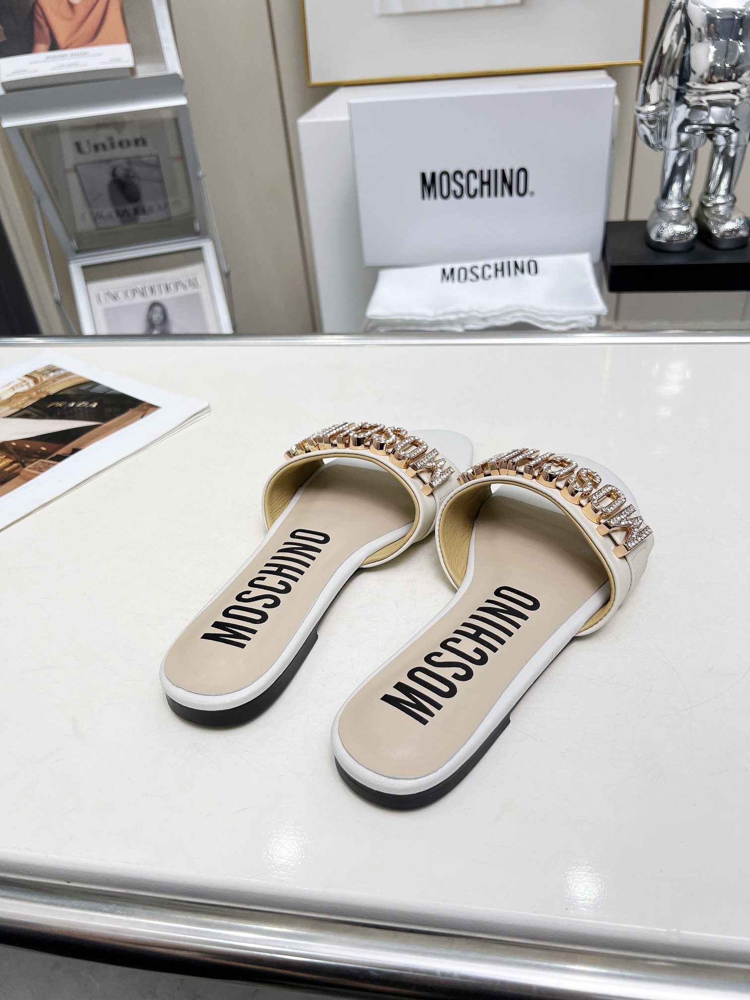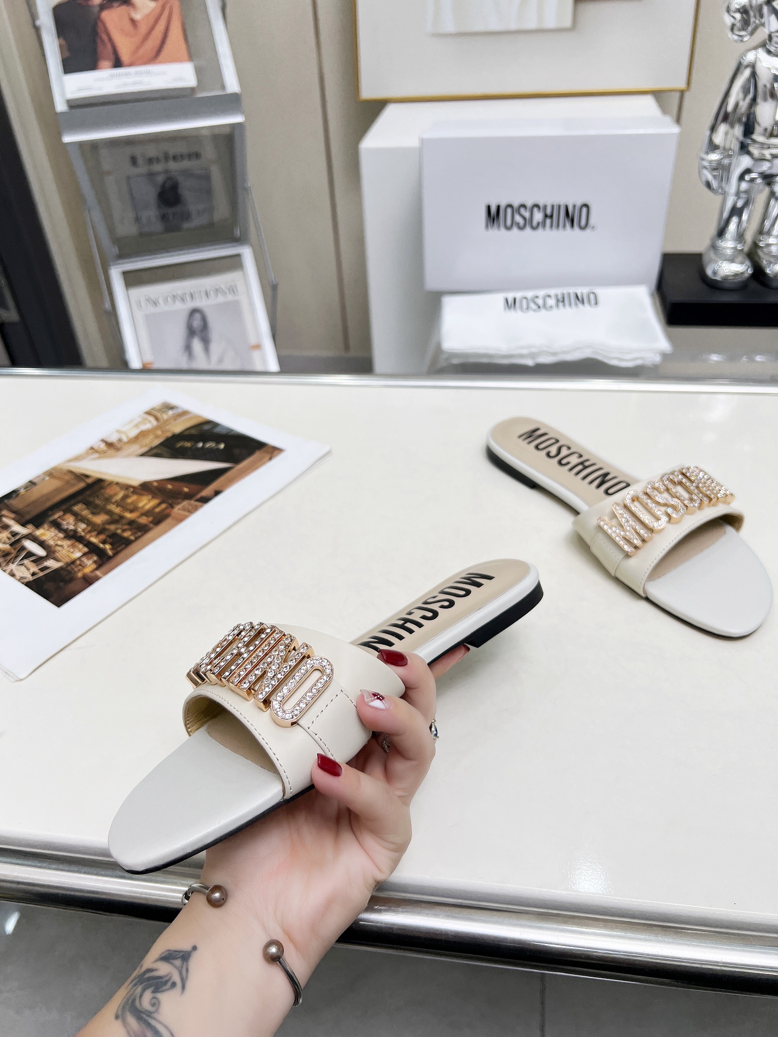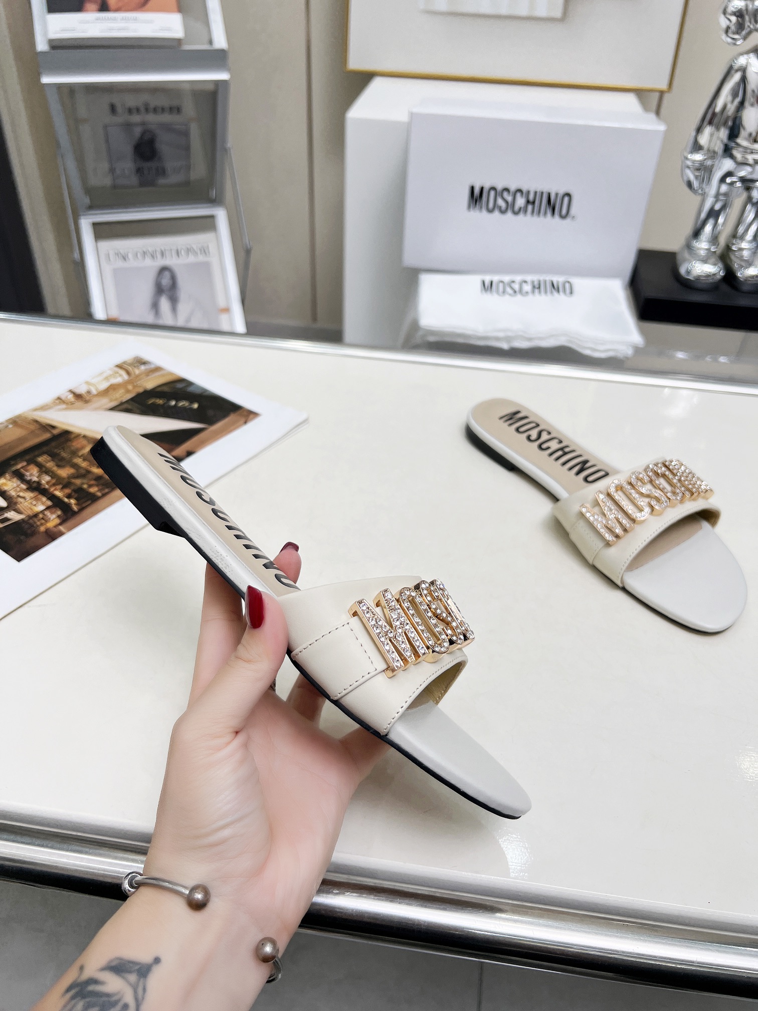 This shoes is AAAAA 1:1 quality (superb). Materials used are identical to the original ones. Moschino trademark marks are indistinguishable to the authentic. Photos take by actual shoes, what you receive will be 100% same with our photos.