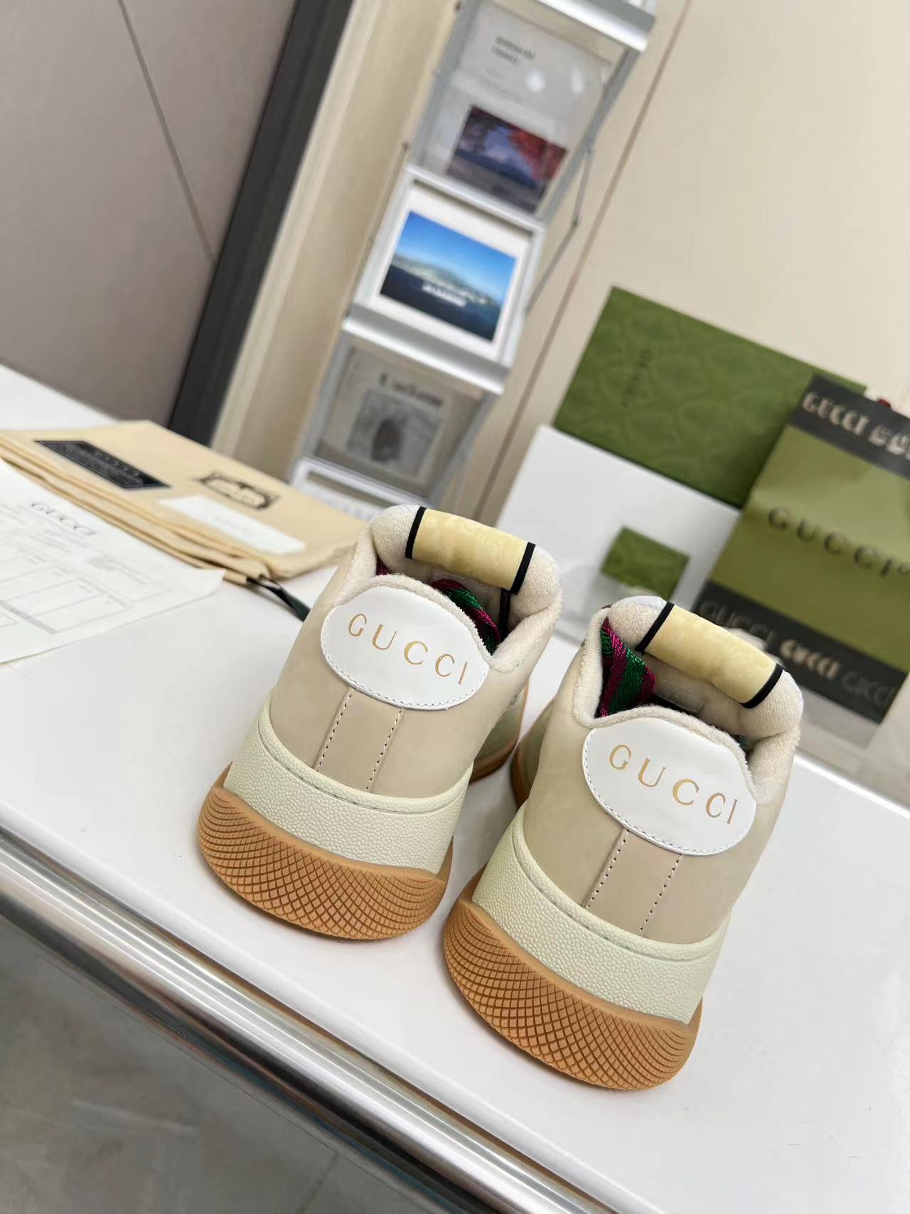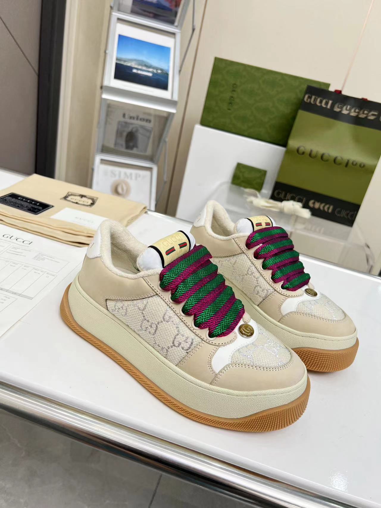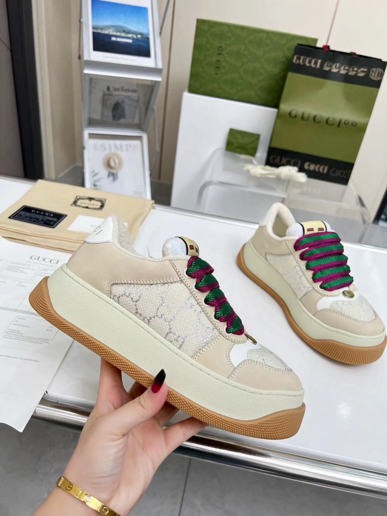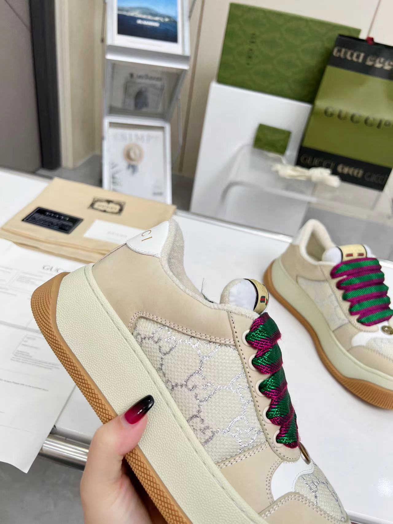 This shoes is AAAAA 1:1 quality (superb). Materials used are identical to the original ones. Gucci trademark marks are indistinguishable to the authentic. Photos take by actual shoes, what you receive will be 100% same with our photos.
