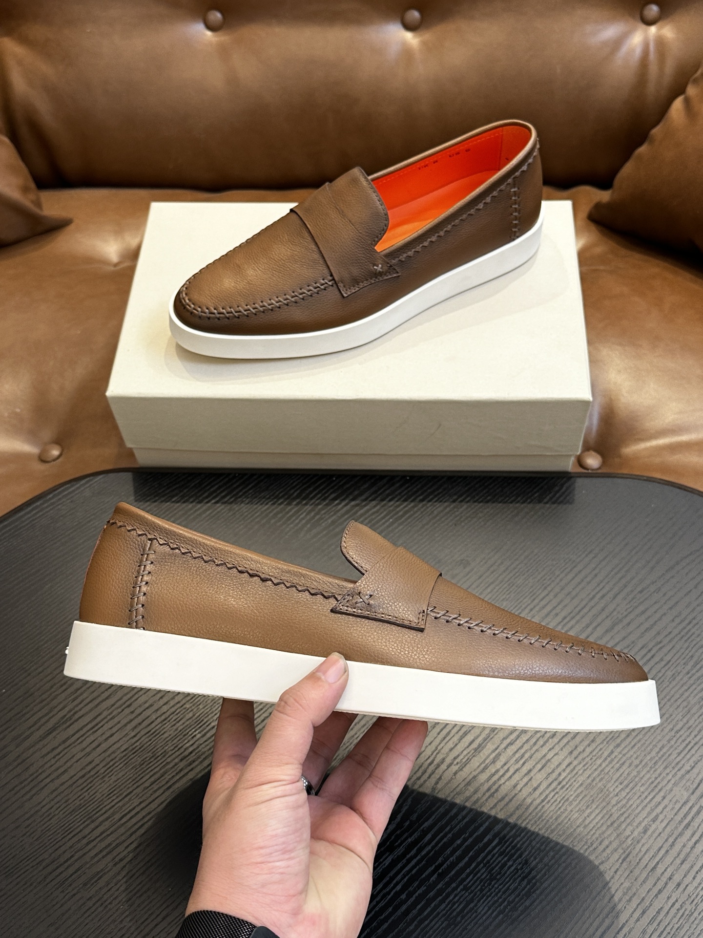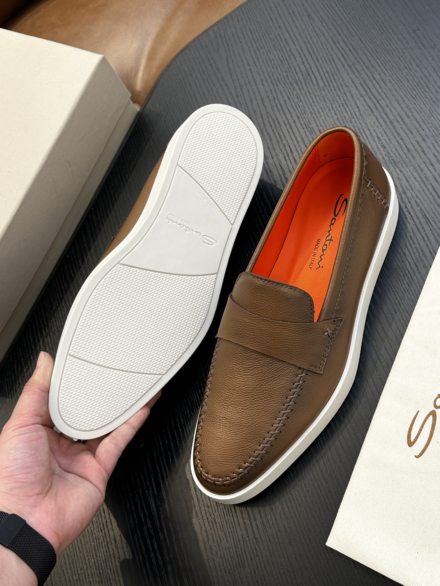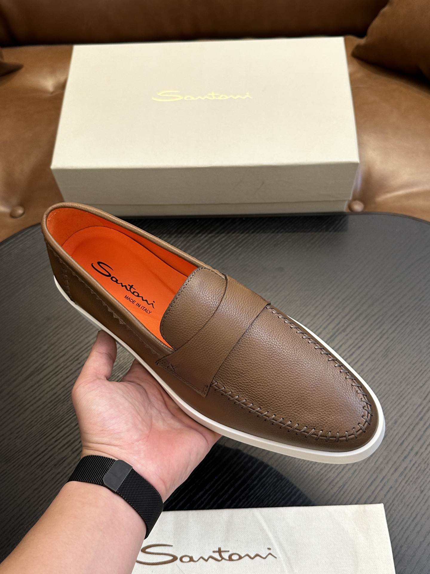 This shoes is AAAAA 1:1 quality (superb). Materials used are identical to the original ones. Santoni trademark marks are indistinguishable to the authentic. Photos take by actual shoes, what you receive will be 100% same with our photos.