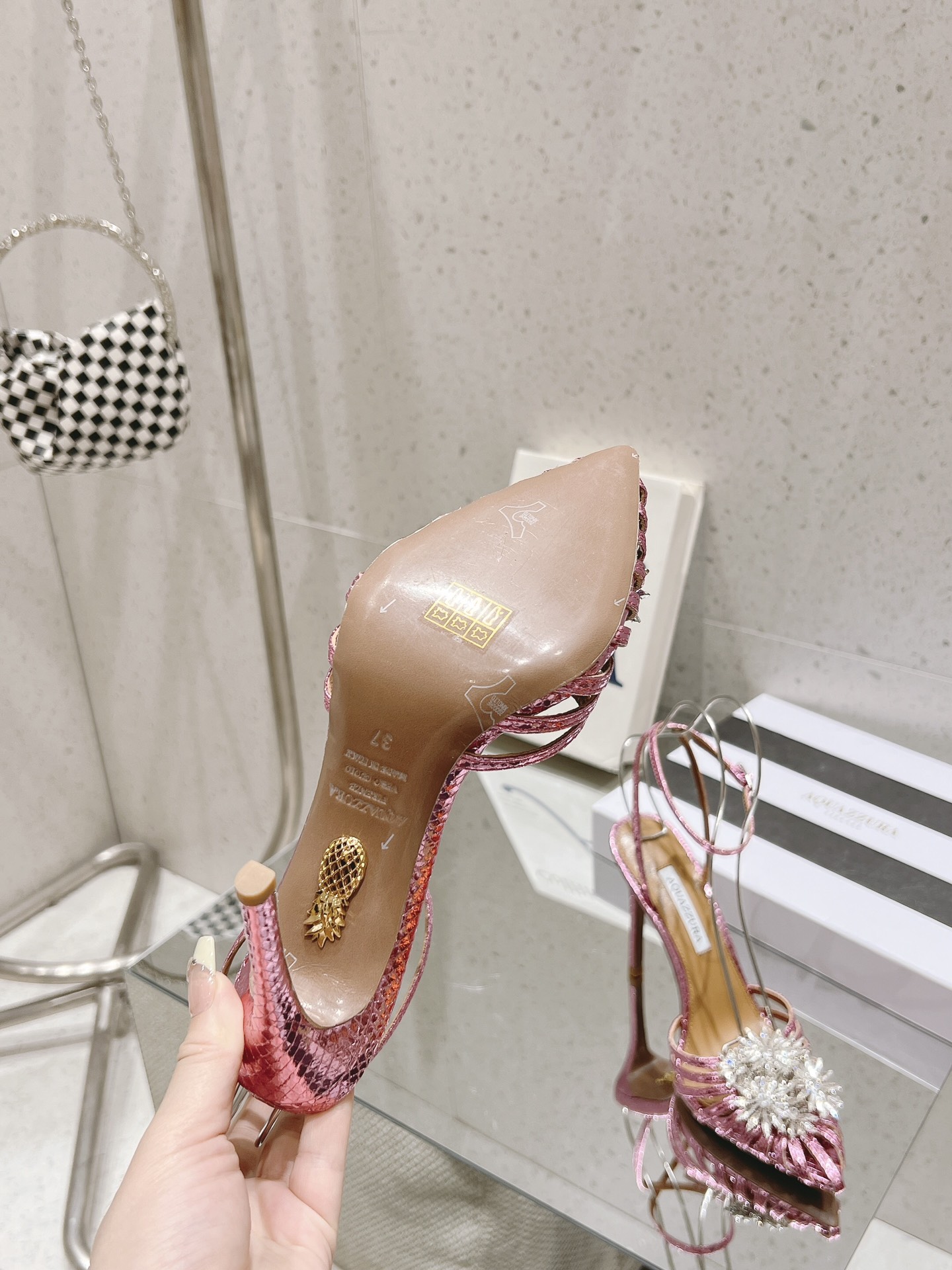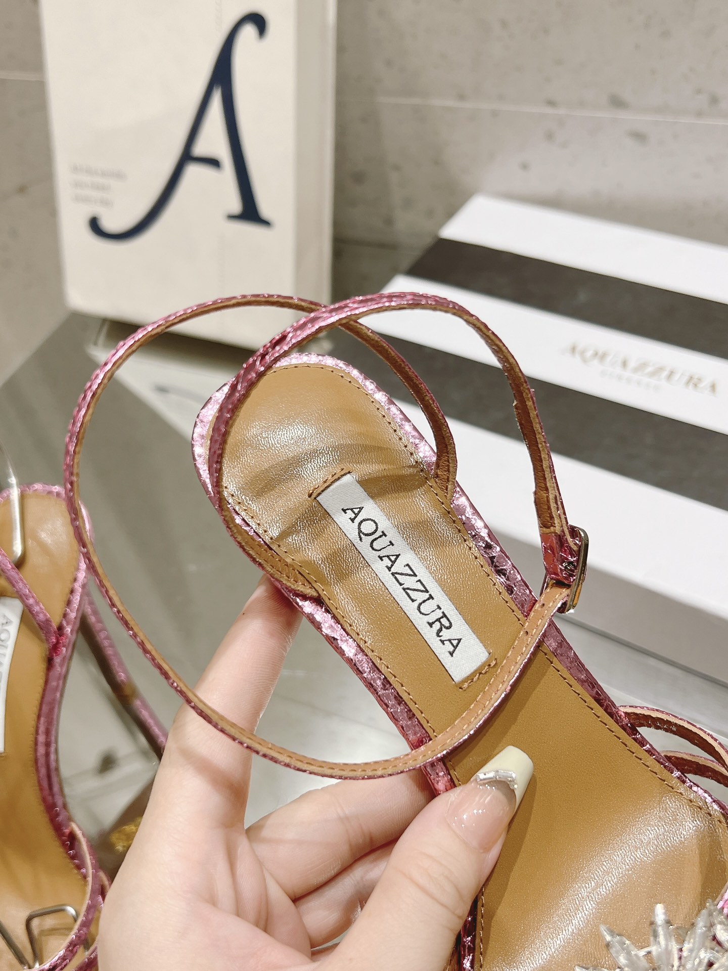 This shoes is AAAAA 1:1 quality (superb). Materials used are identical to the original ones. Aquazzura trademark marks are indistinguishable to the authentic. Photos take by actual shoes, what you receive will be 100% same with our photos.