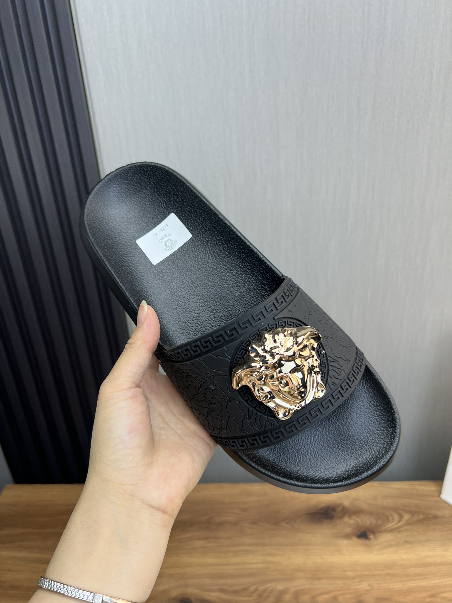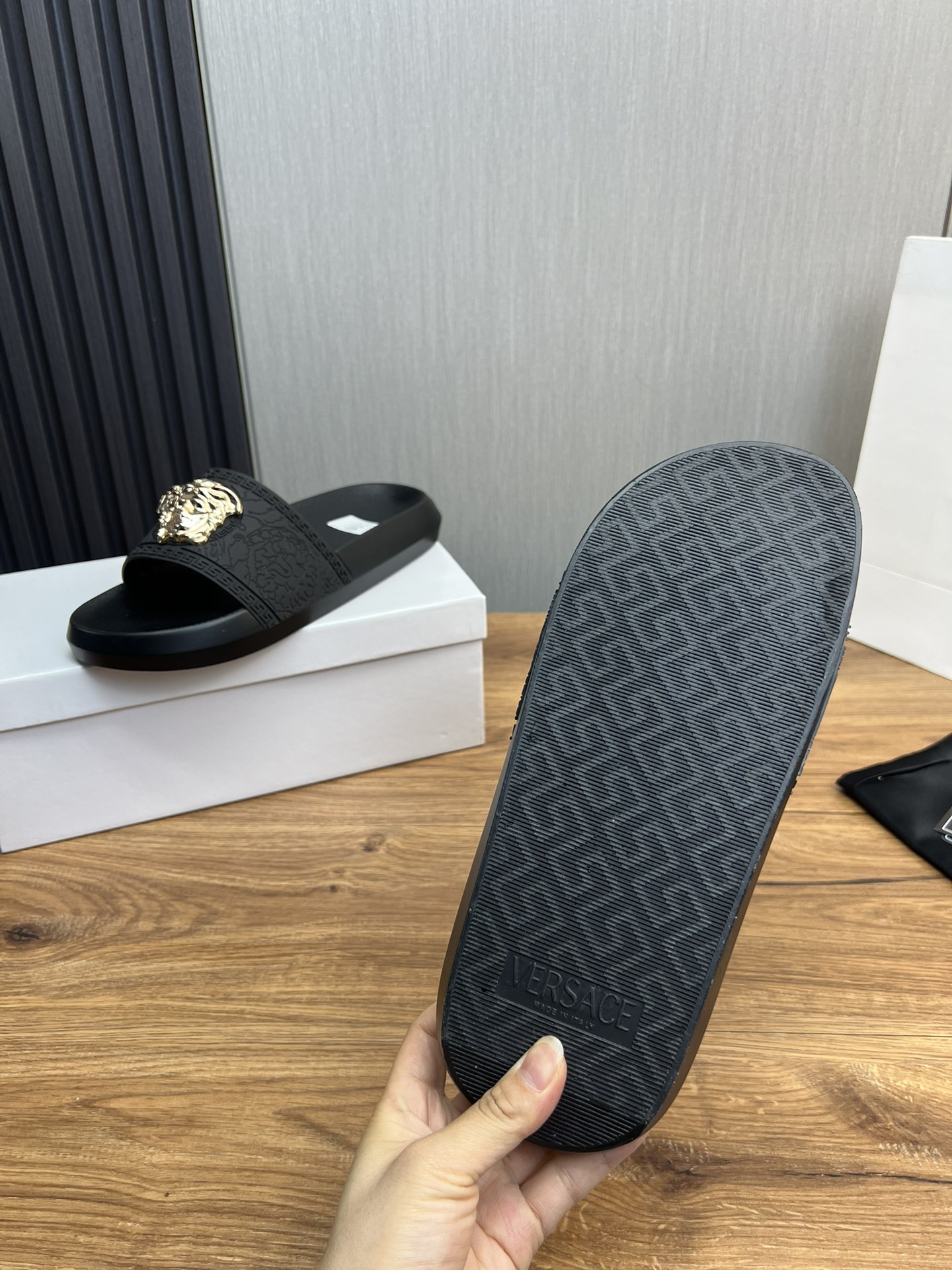 This shoes is AAAAA 1:1 quality (superb). Materials used are identical to the original ones. Versace trademark marks are indistinguishable to the authentic. Photos take by actual shoes, what you receive will be 100% same with our photos.