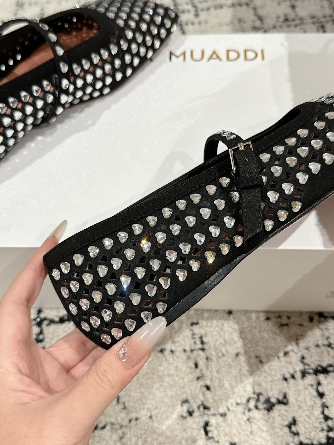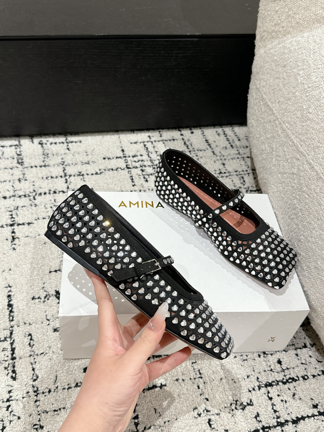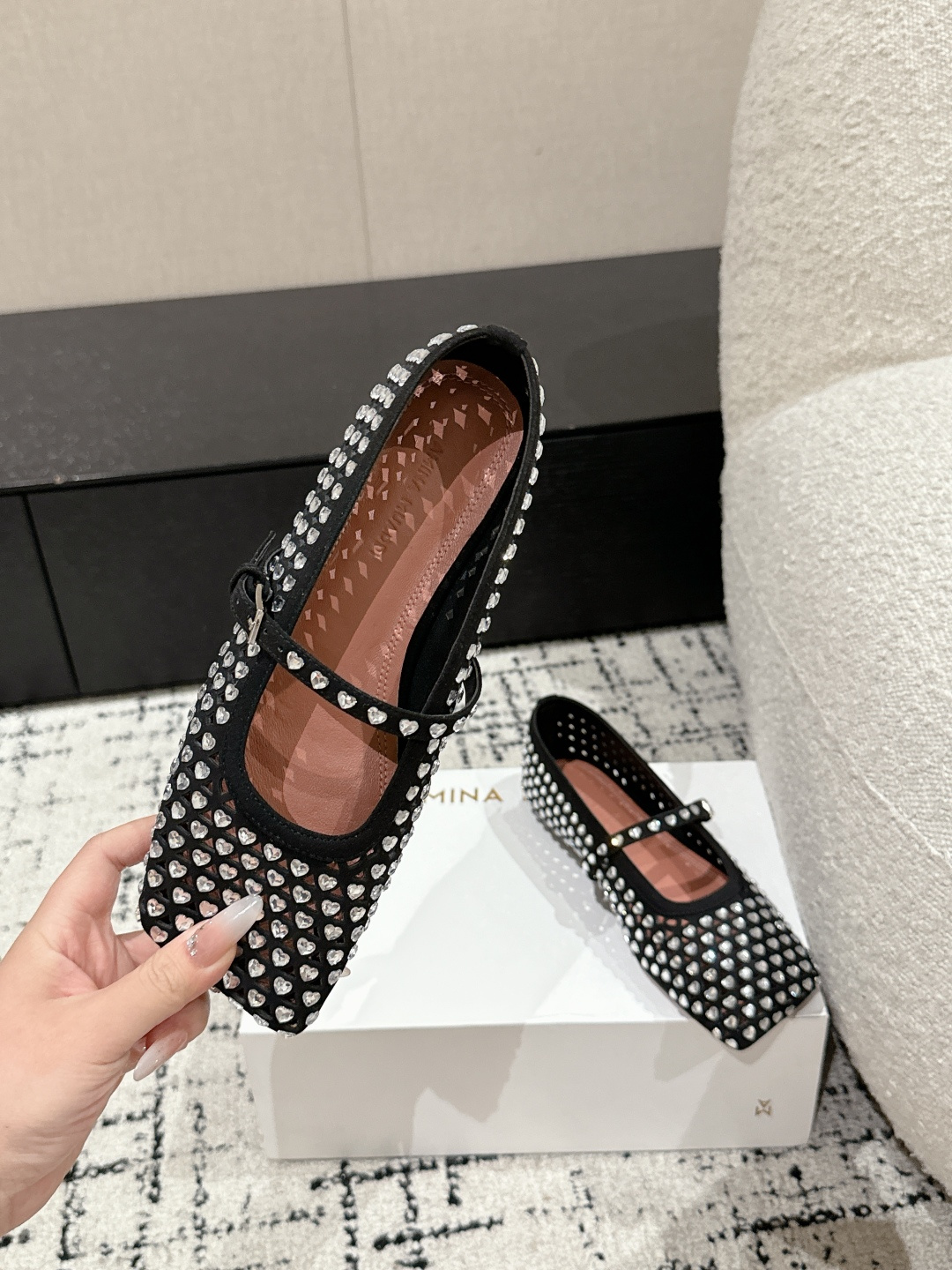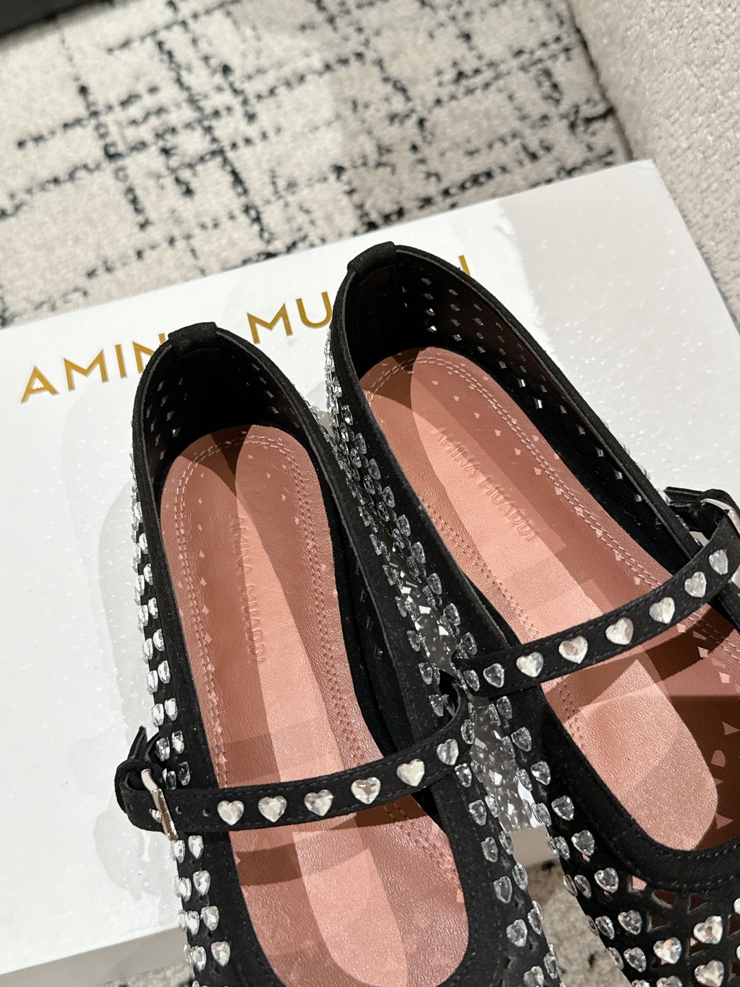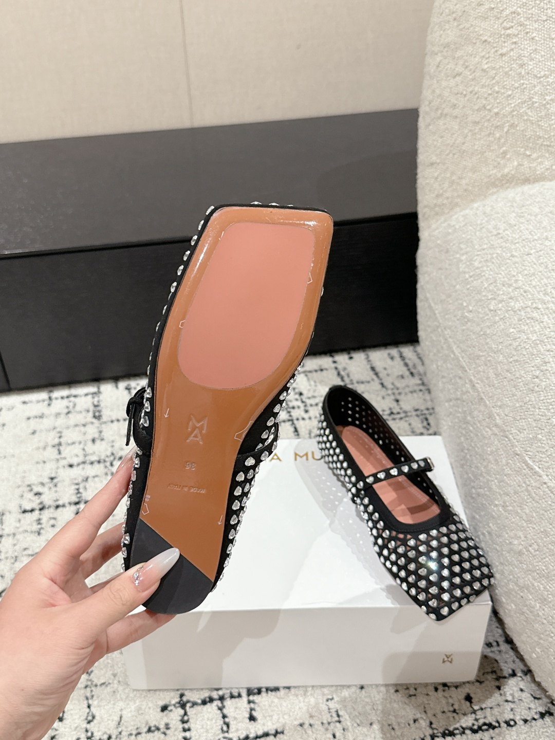 This shoes is AAAAA 1:1 quality (superb). Materials used are identical to the original ones. Amina Muaddi trademark marks are indistinguishable to the authentic. Photos take by actual shoes, what you receive will be 100% same with our photos.