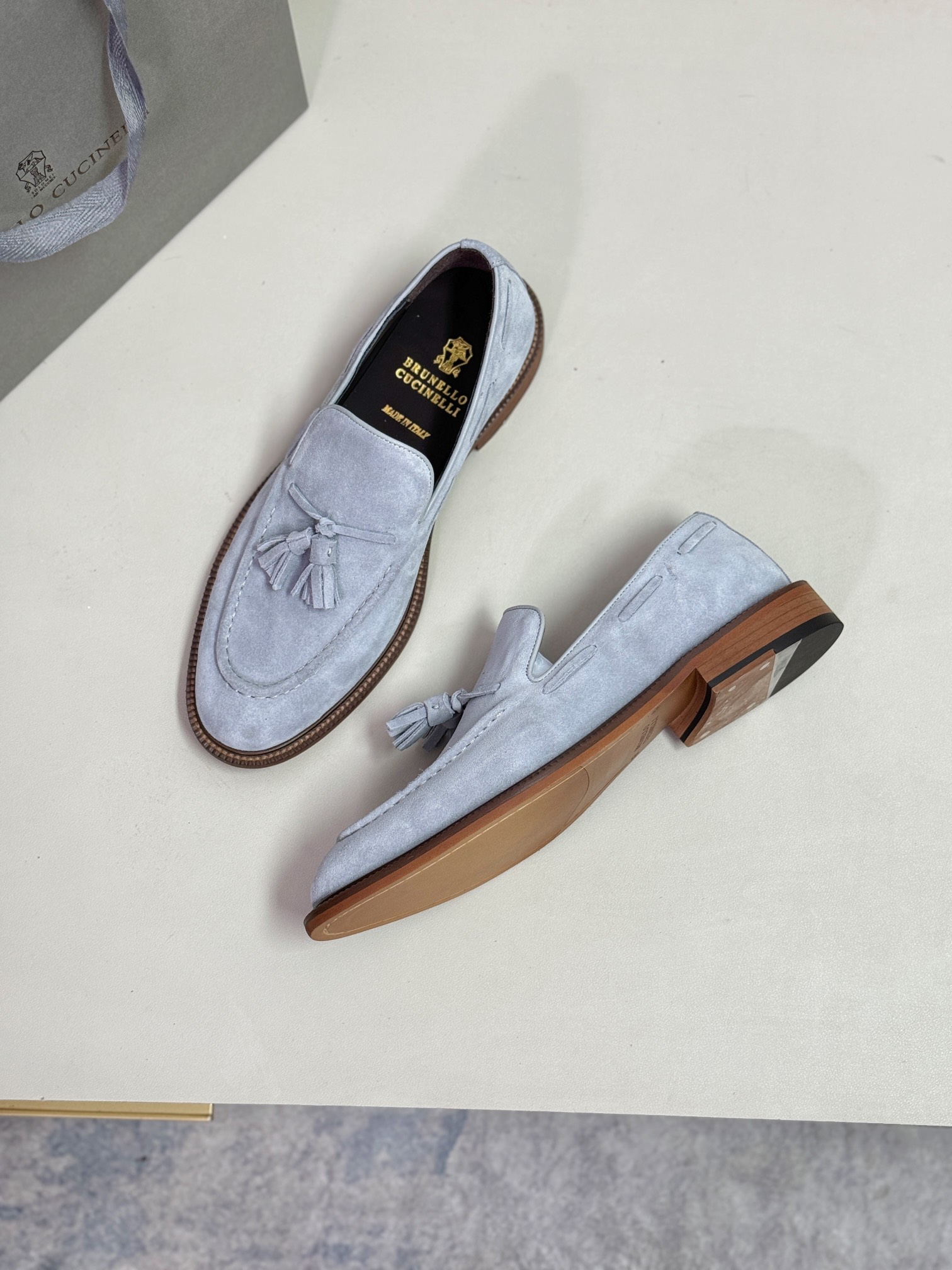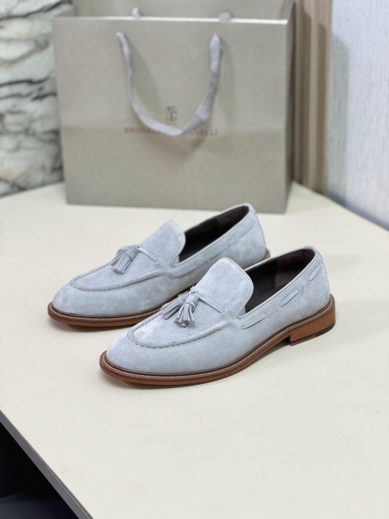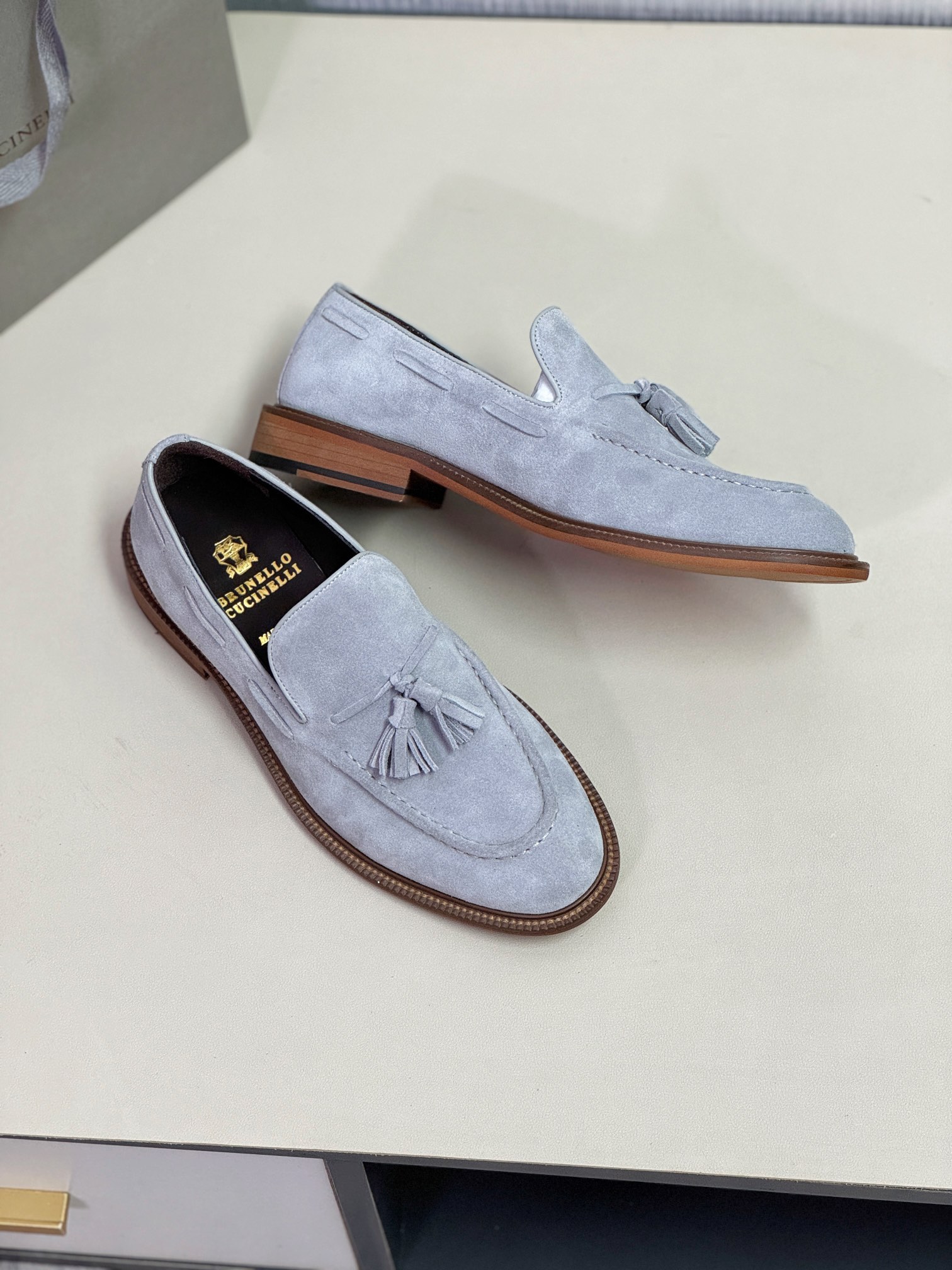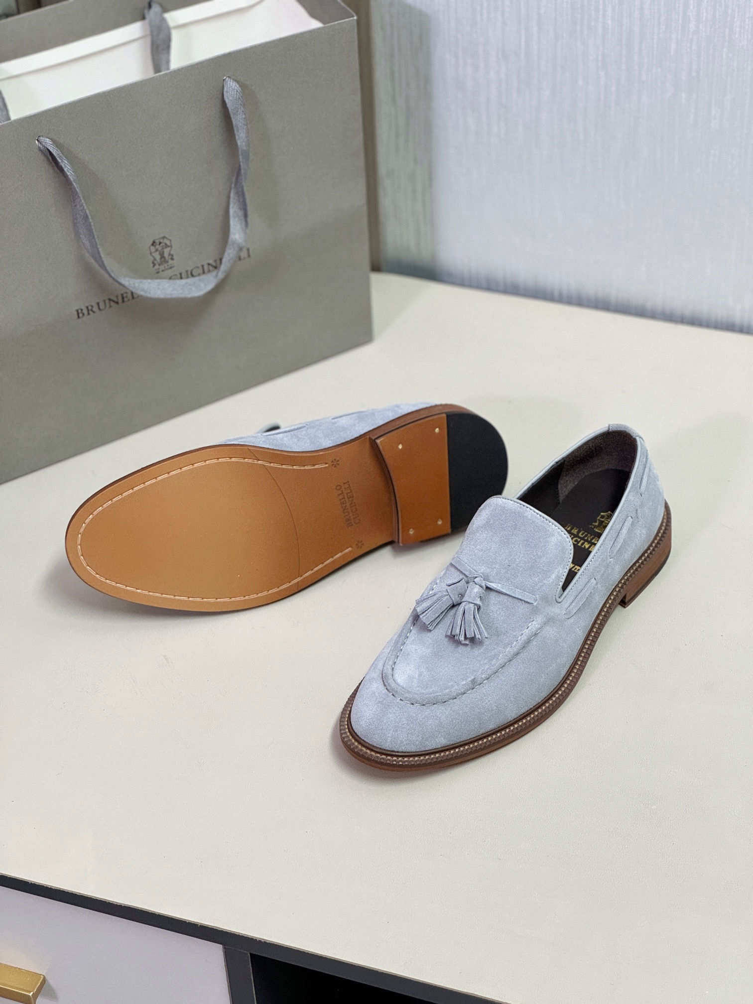 This shoes is AAAAA 1:1 quality (superb). Materials used are identical to the original ones. Brunello Cucinelli trademark marks are indistinguishable to the authentic. Photos take by actual shoes, what you receive will be 100% same with our photos.