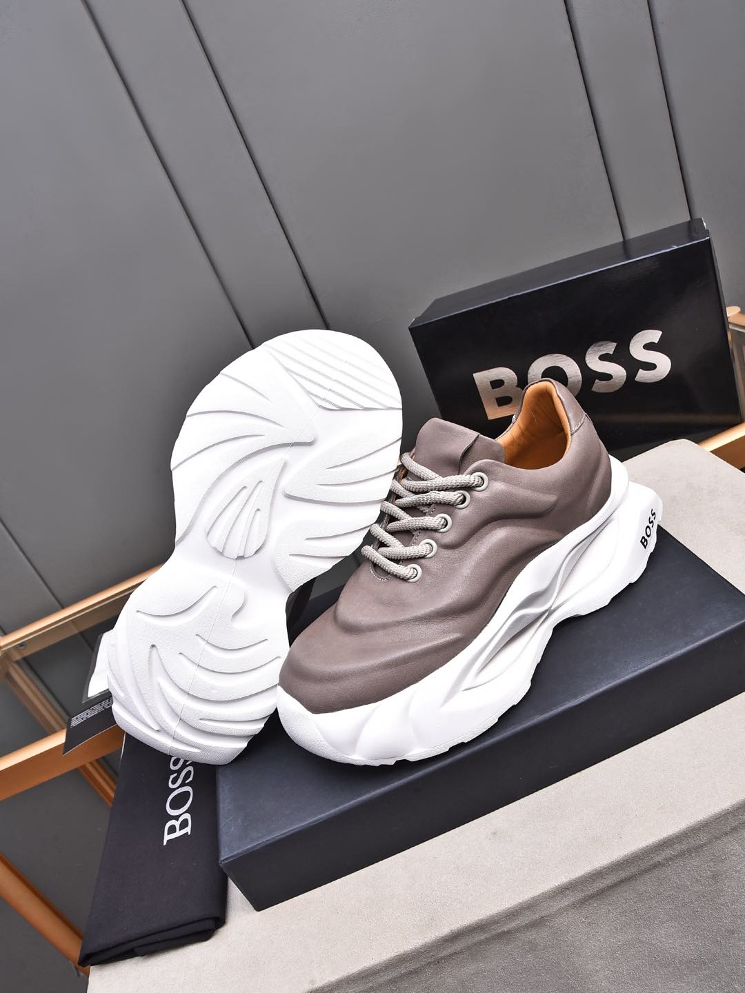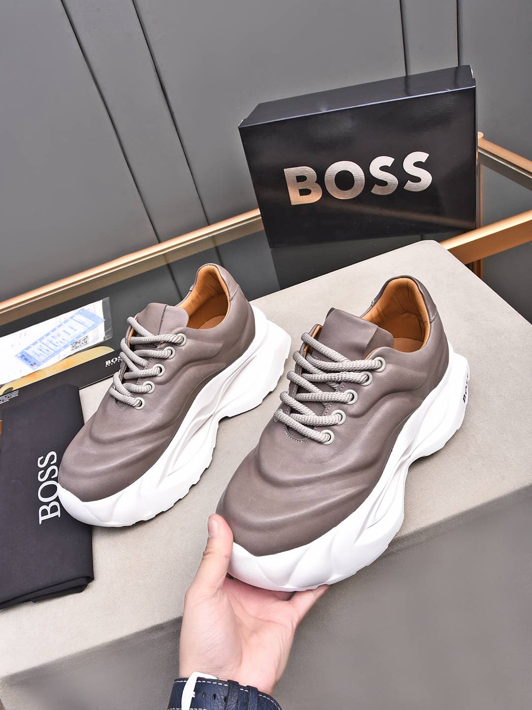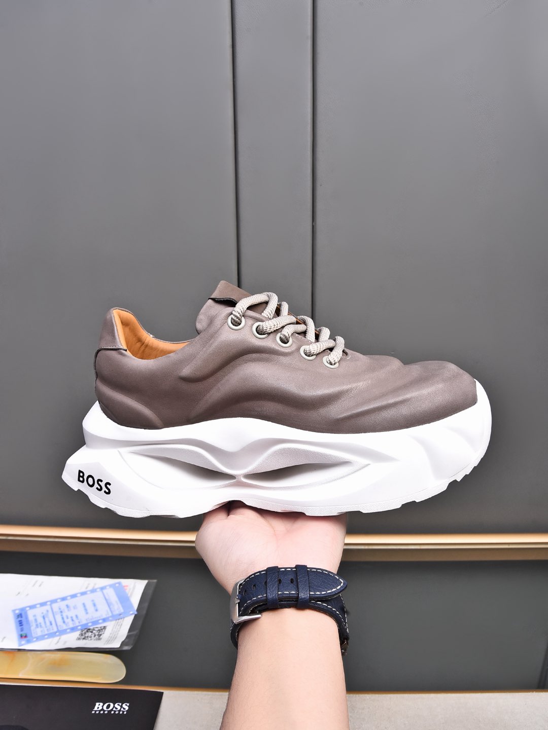 This shoes is AAAAA 1:1 quality (superb). Materials used are identical to the original ones. BOSS trademark marks are indistinguishable to the authentic. Photos take by actual shoes, what you receive will be 100% same with our photos.