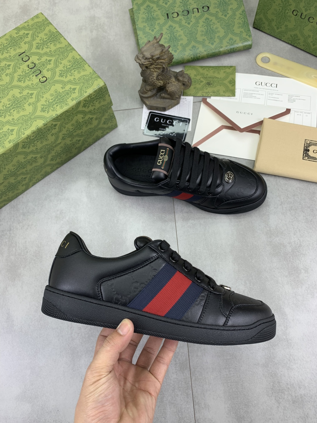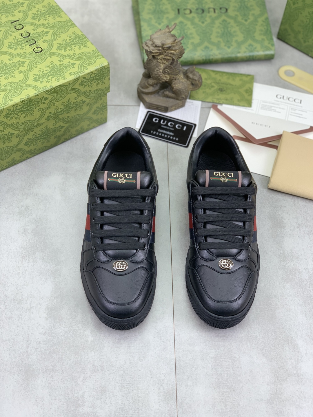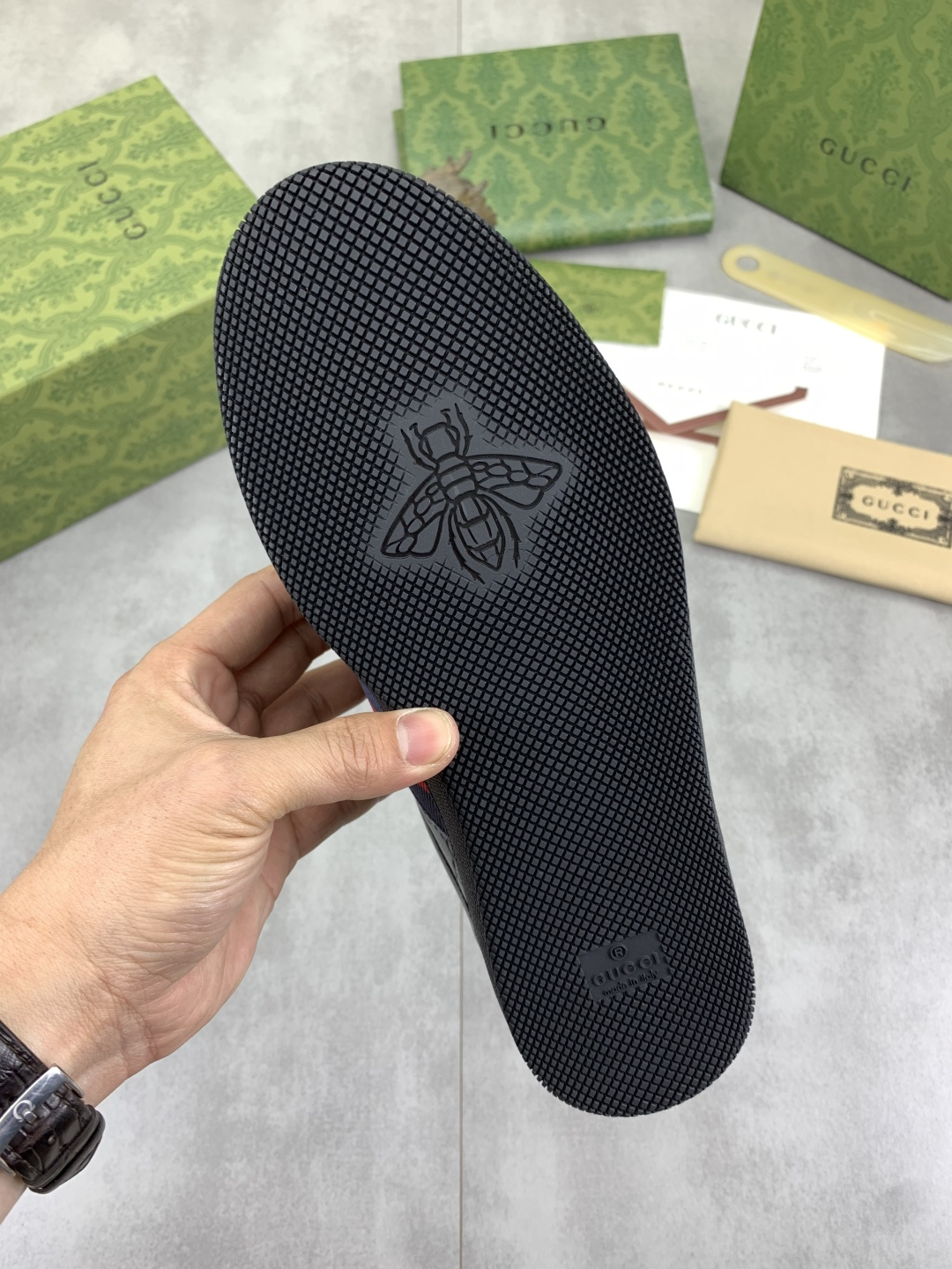 This shoes is AAAAA 1:1 quality (superb). Materials used are identical to the original ones. Gucci trademark marks are indistinguishable to the authentic. Photos take by actual shoes, what you receive will be 100% same with our photos.