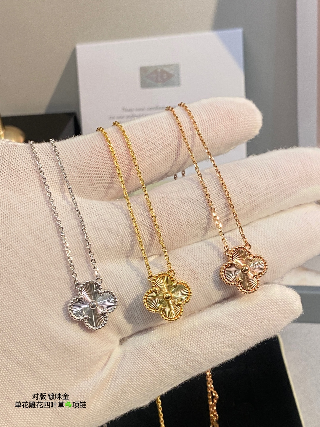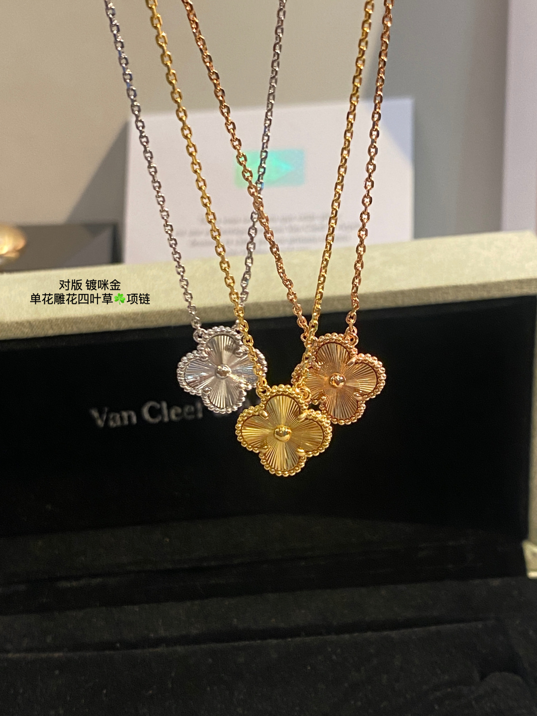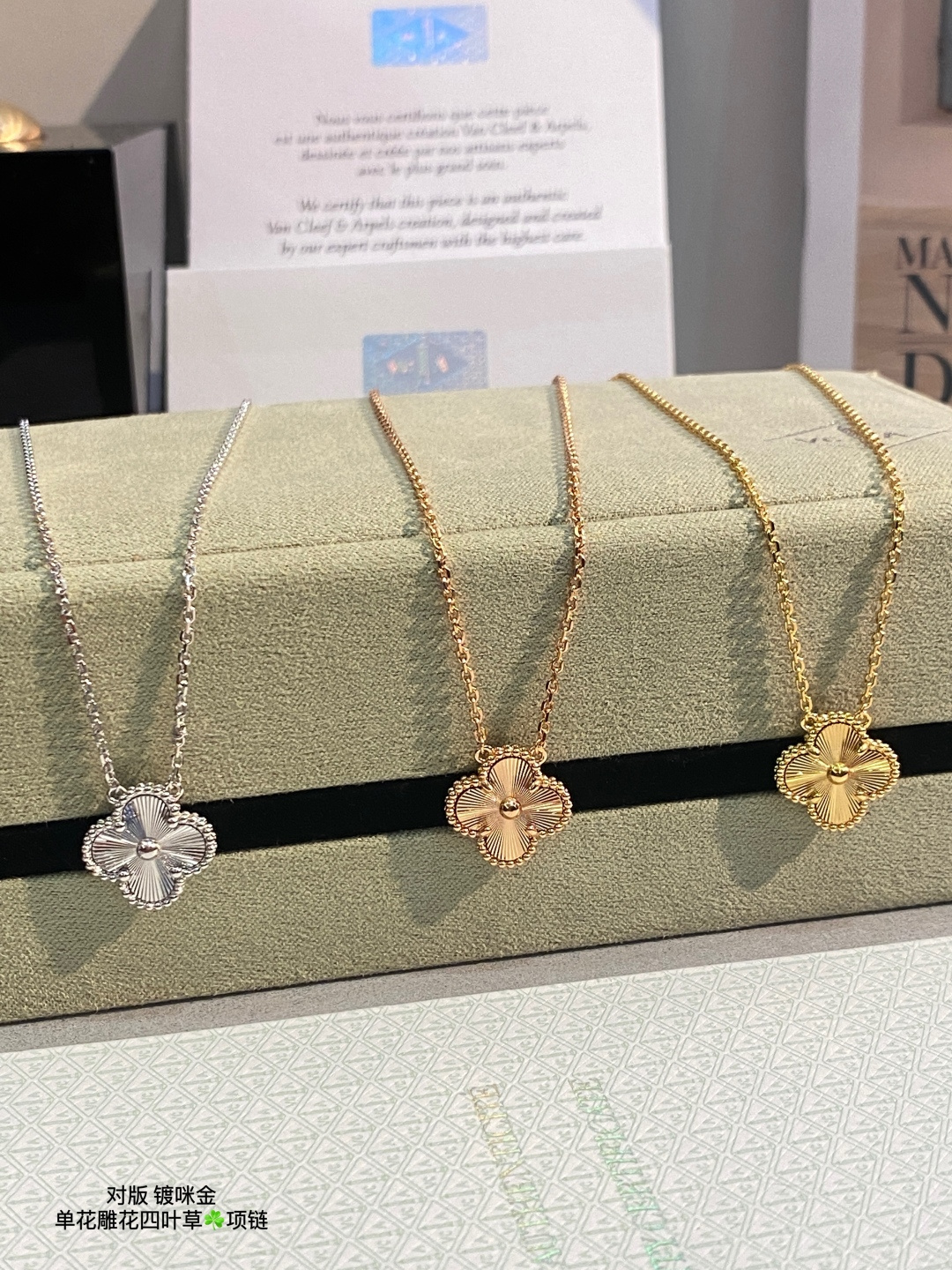 This jewelry is AAAAA 1:1 quality (superb). Materials used are identical to the original ones. Van Cleef & Arpels trademark marks are indistinguishable to the authentic. Photos take by actual jewelry, what you receive will be 100% same with our photos.