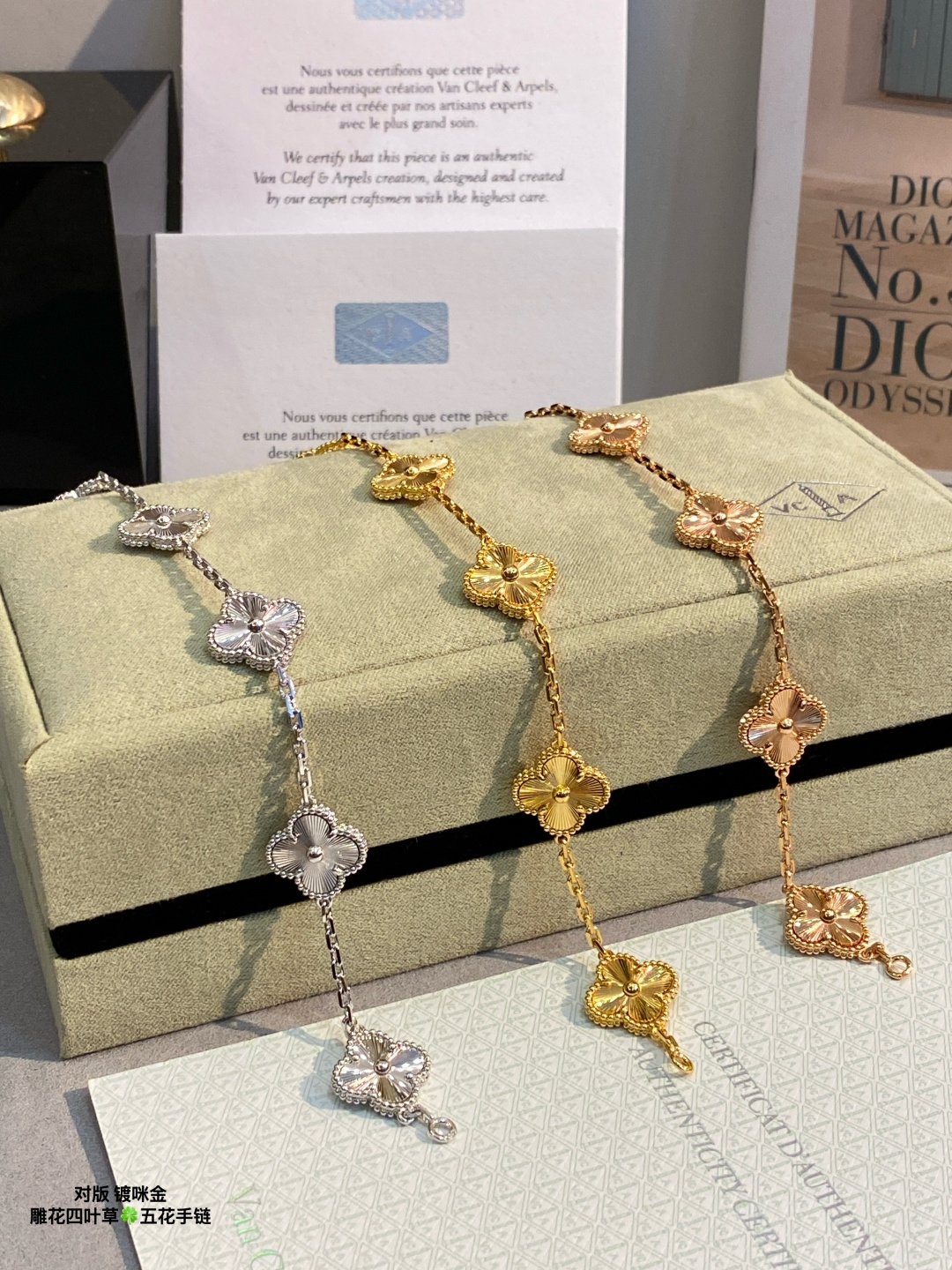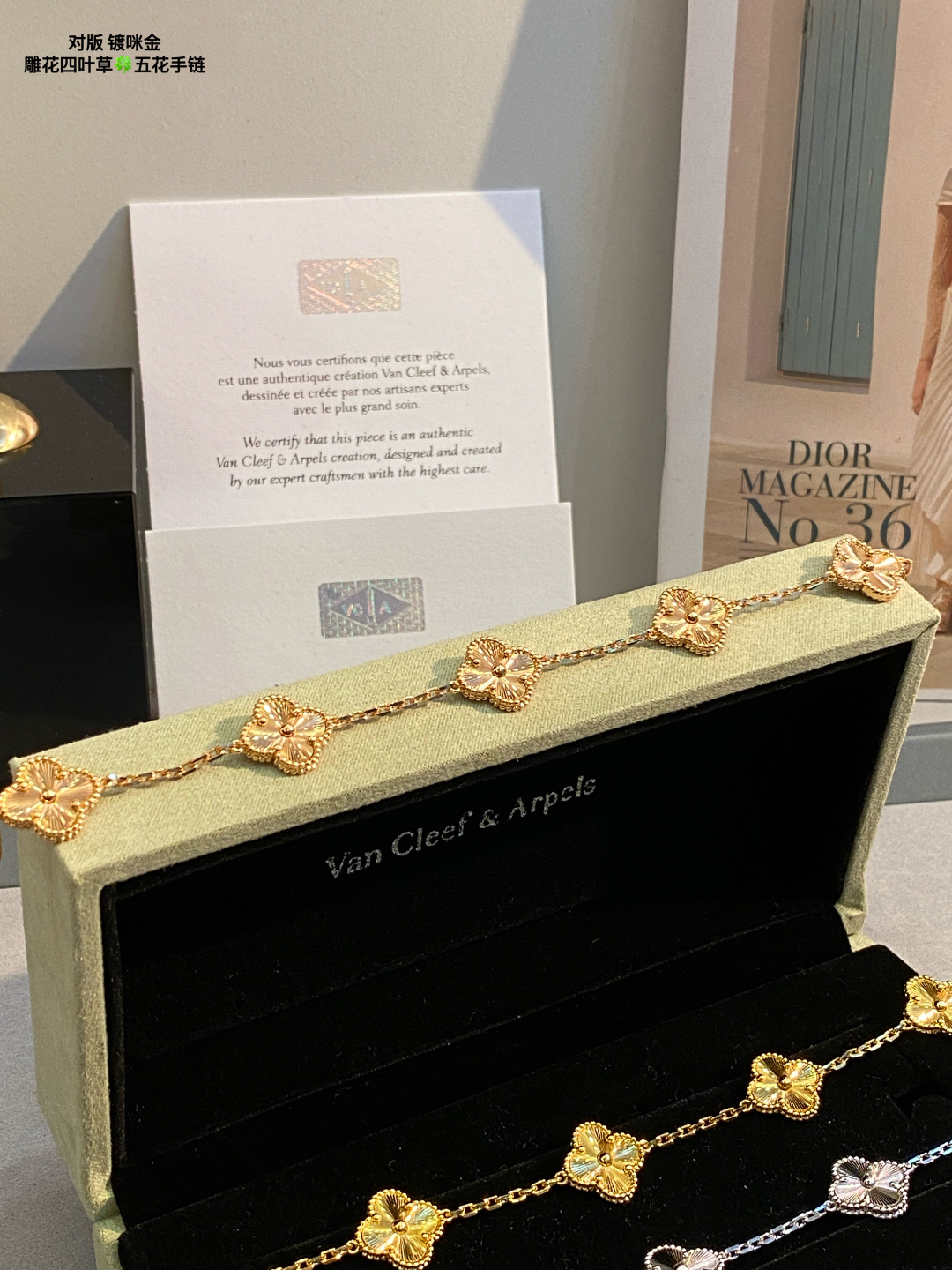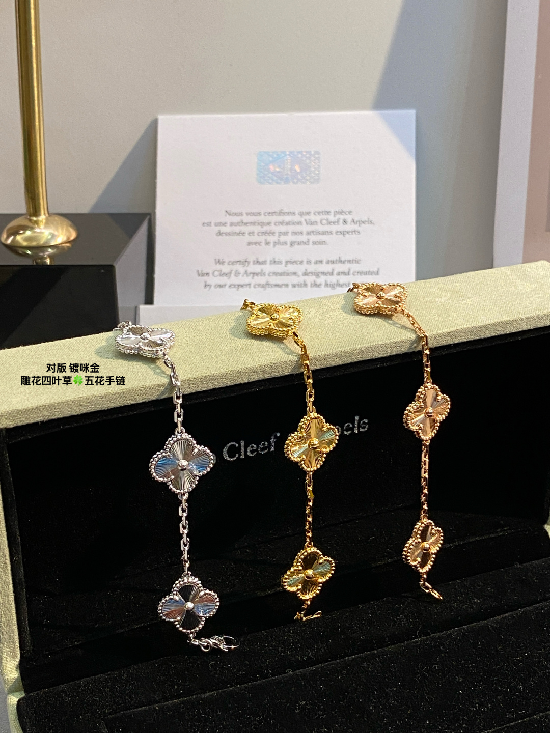 This jewelry is AAAAA 1:1 quality (superb). Materials used are identical to the original ones. Van Cleef & Arpels trademark marks are indistinguishable to the authentic. Photos take by actual jewelry, what you receive will be 100% same with our photos.