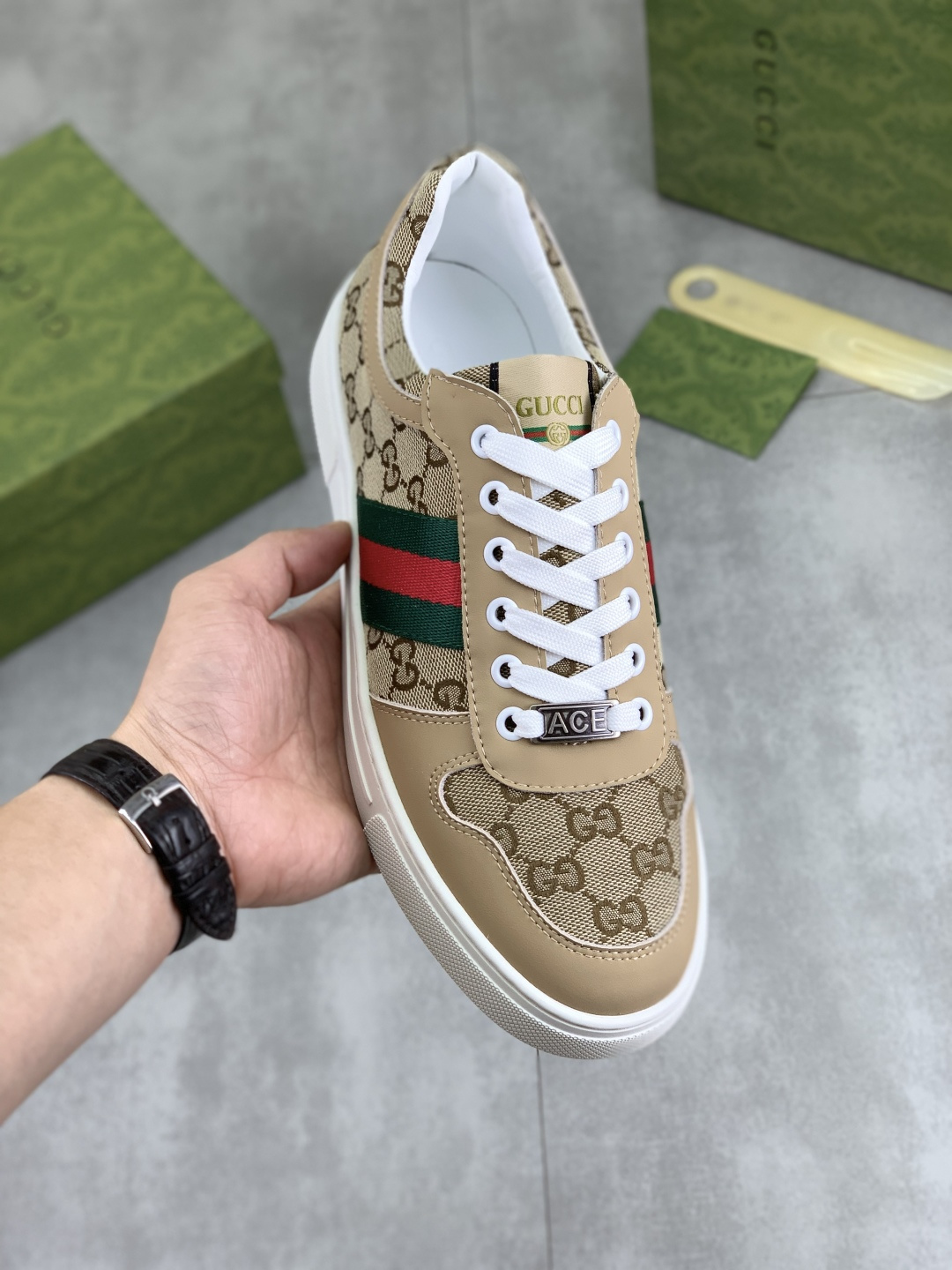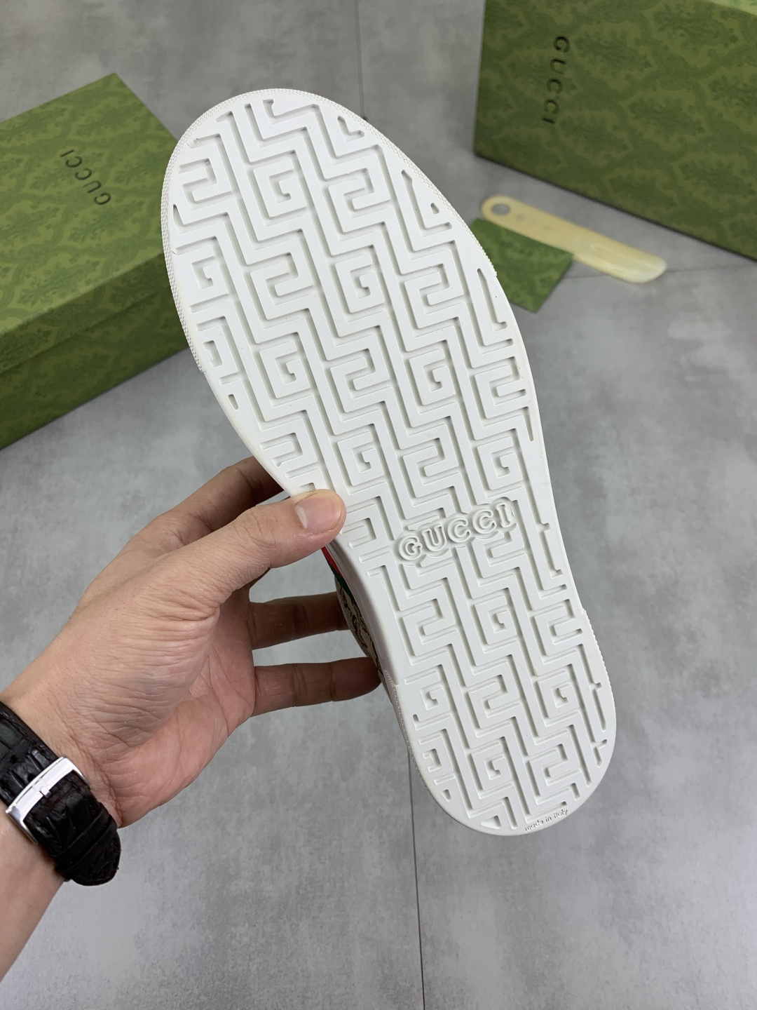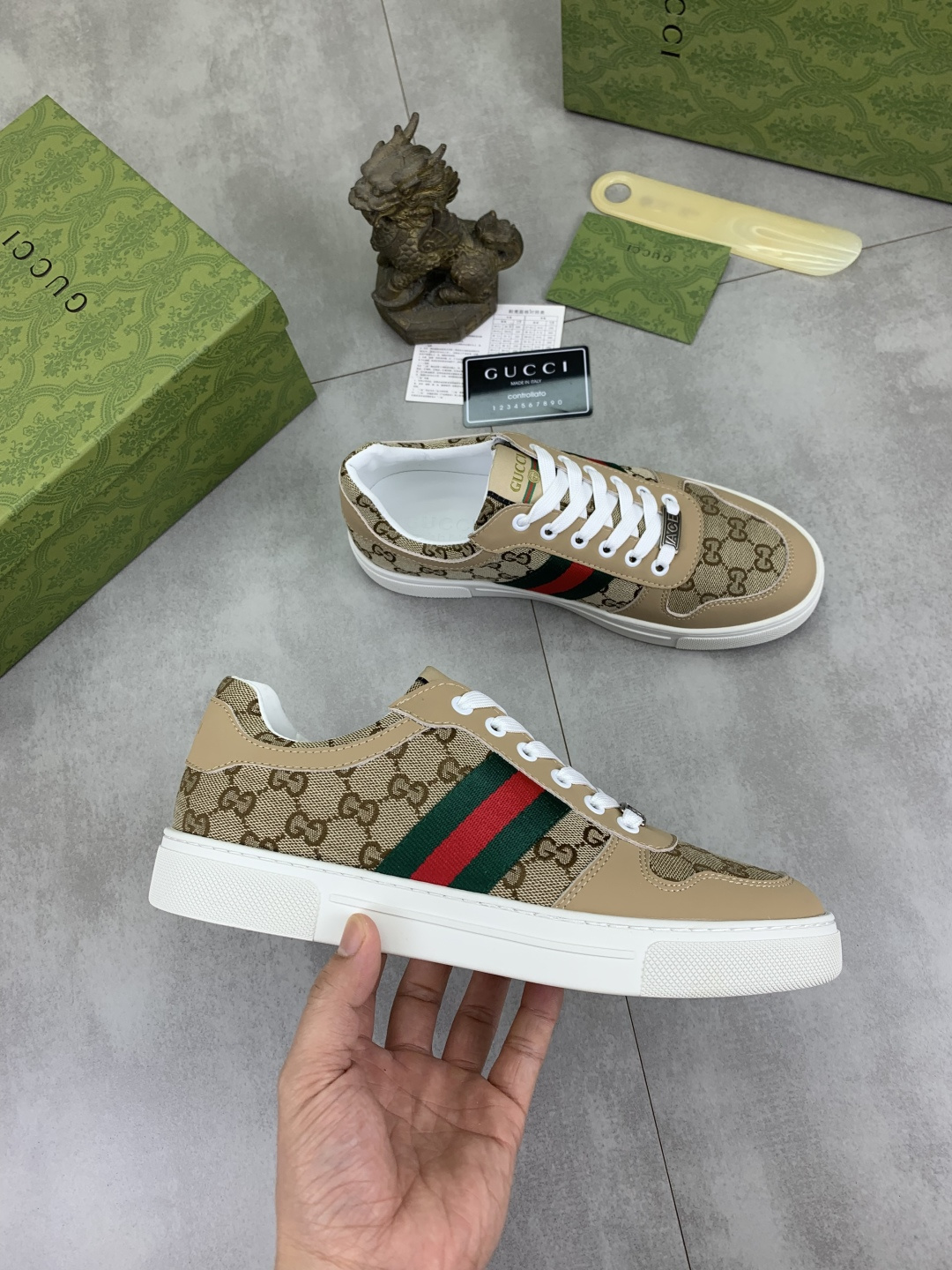 This shoes is AAAAA 1:1 quality (superb). Materials used are identical to the original ones. Gucci trademark marks are indistinguishable to the authentic. Photos take by actual shoes, what you receive will be 100% same with our photos.