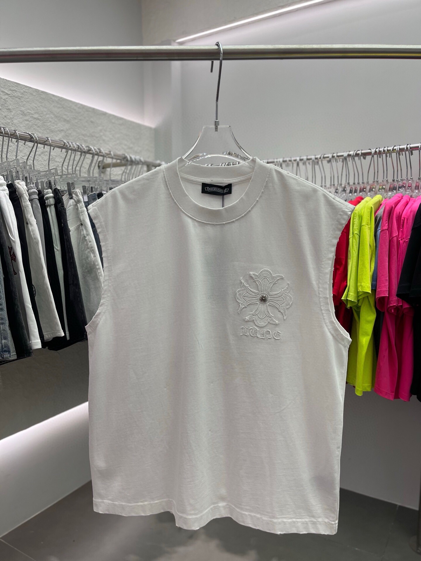 NO:3214120. The clothes is from Chrome Hearts designer.