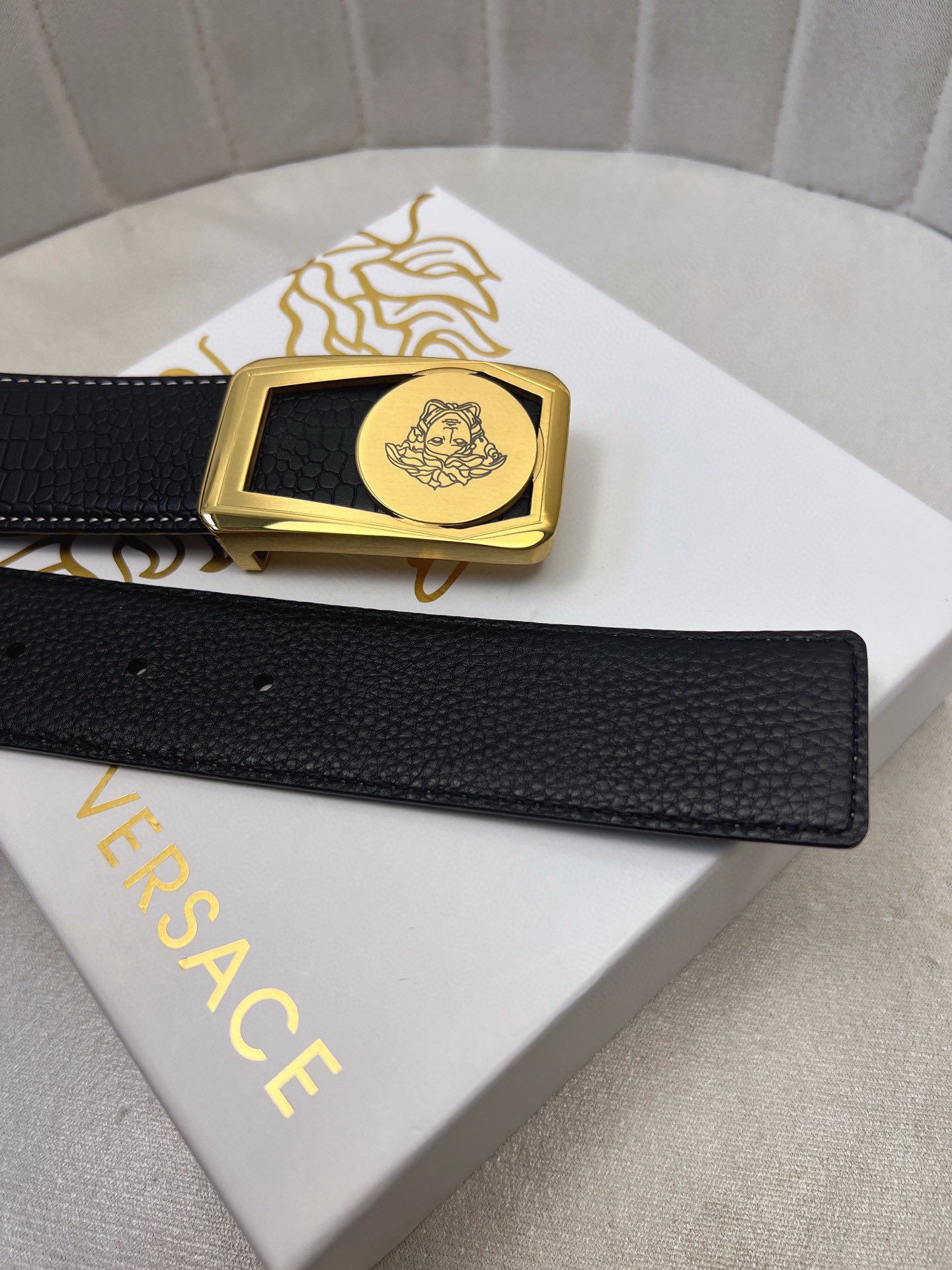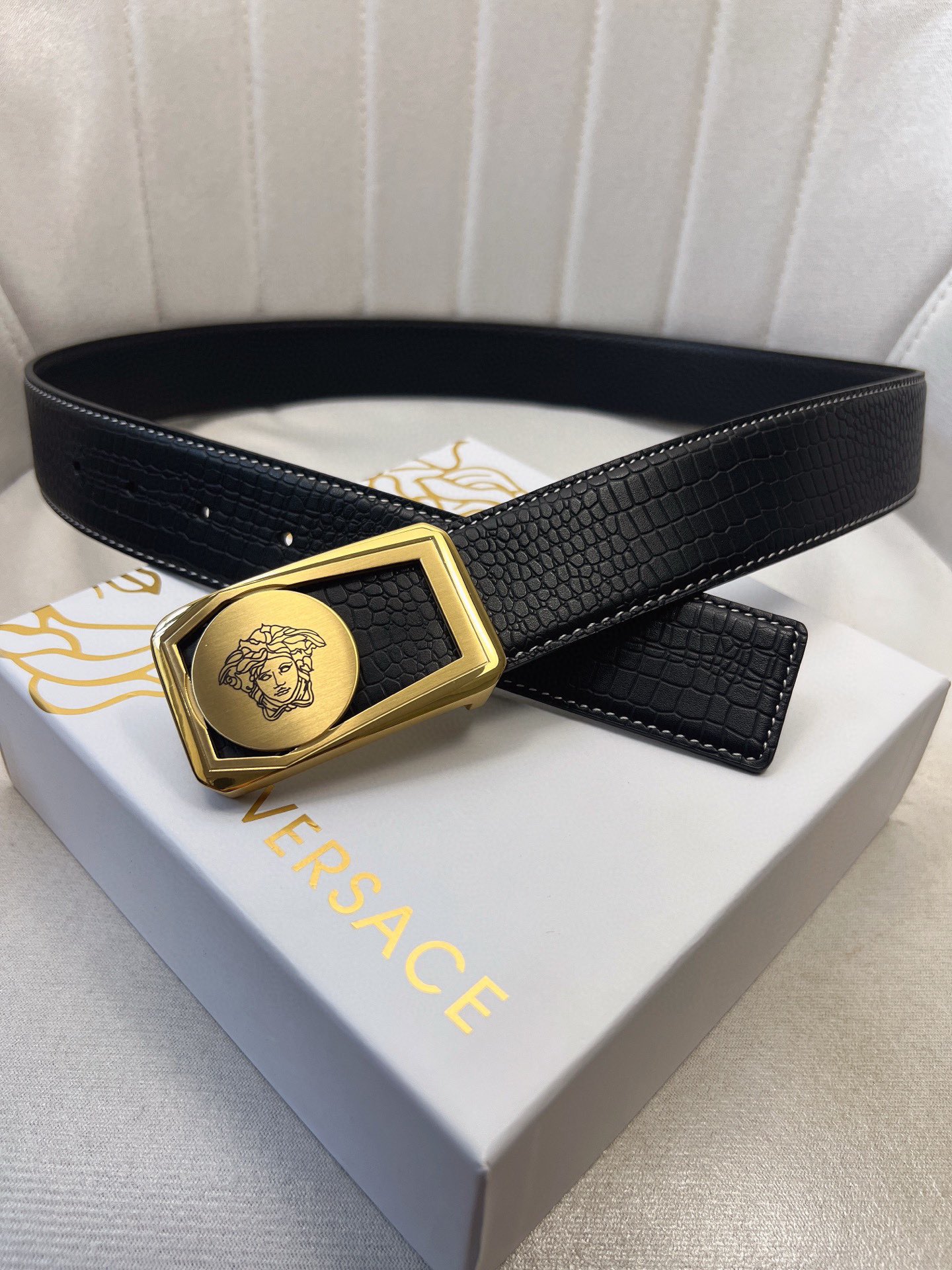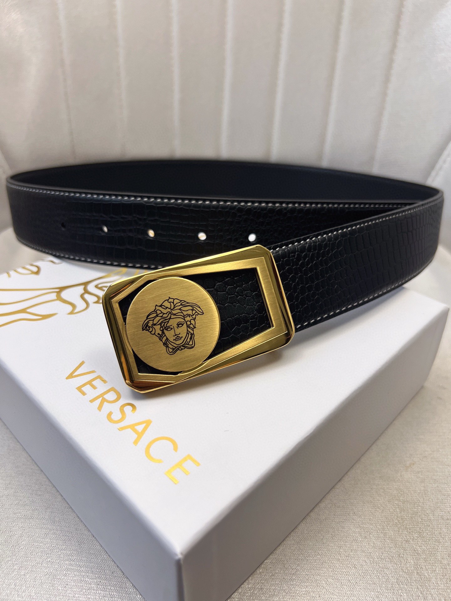 This belt is AAAAA 1:1 quality (superb). Materials used are identical to the original ones. Versace trademark marks are indistinguishable to the authentic. Photos take by actual belt, what you receive will be 100% same with our photos.