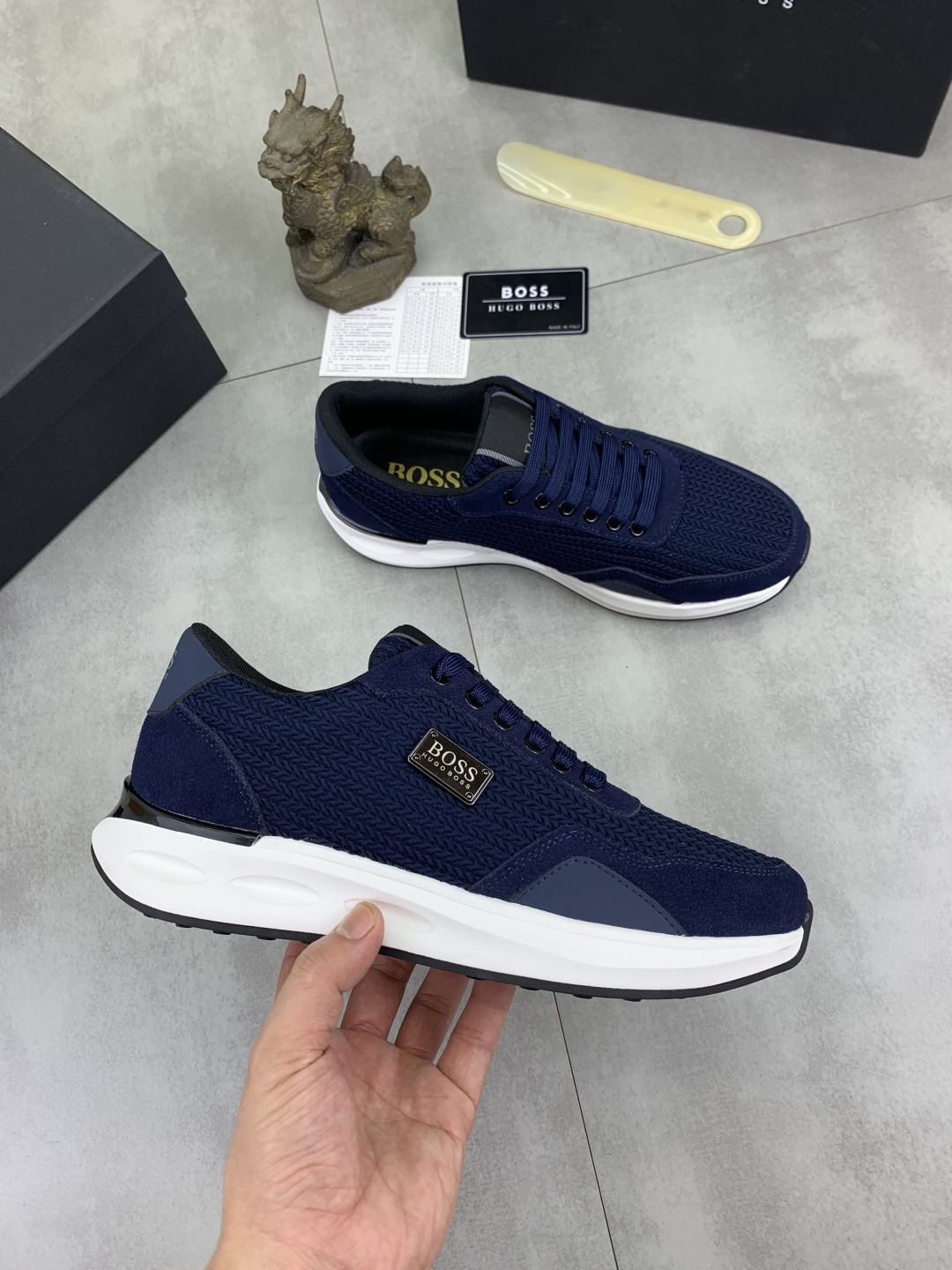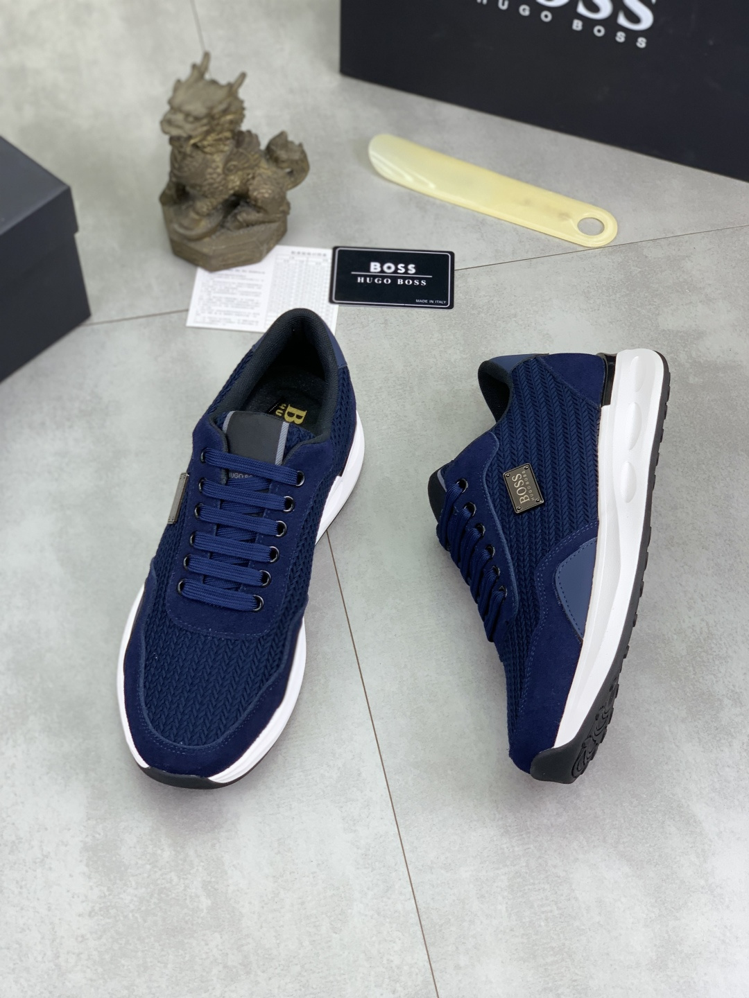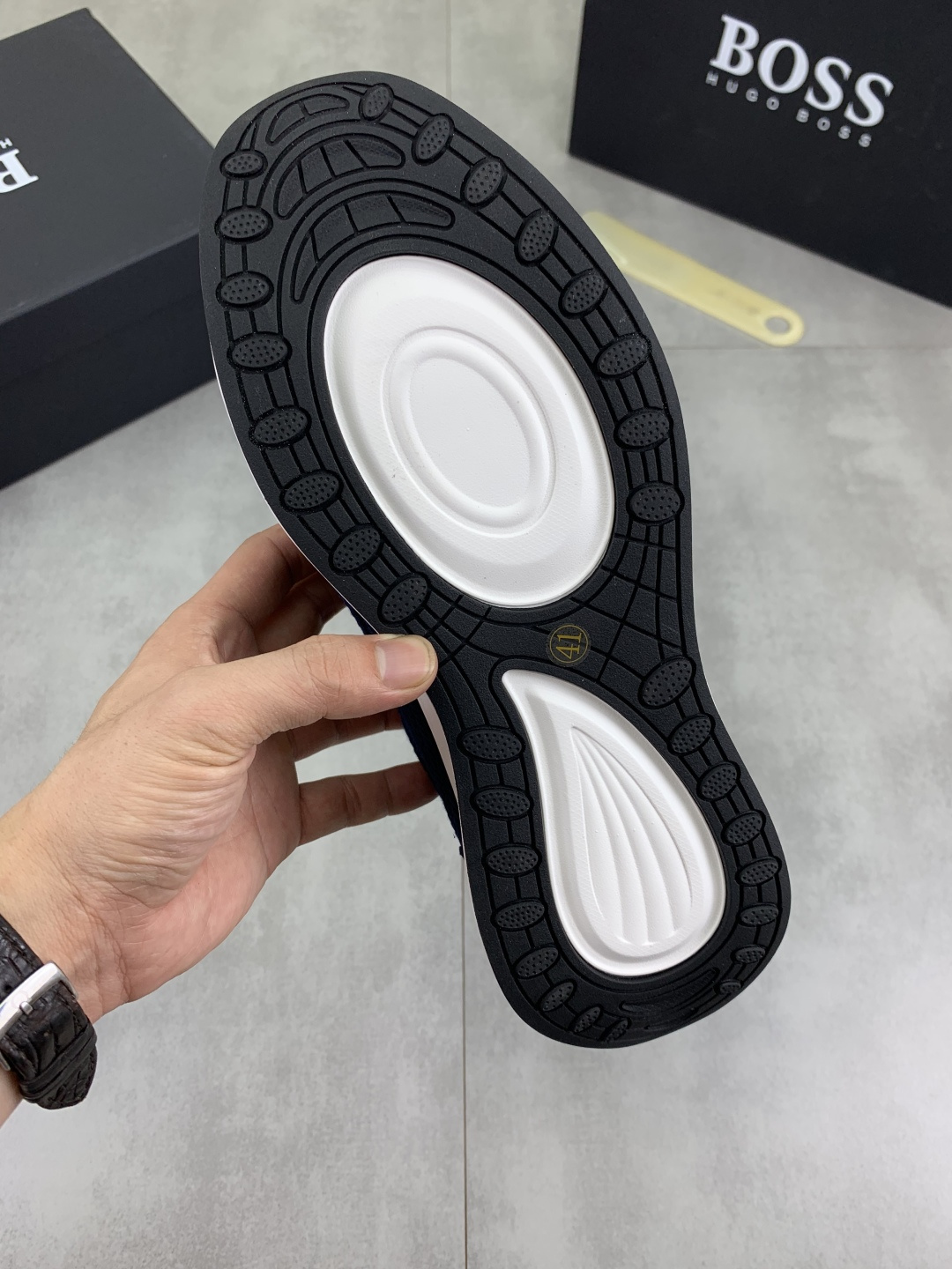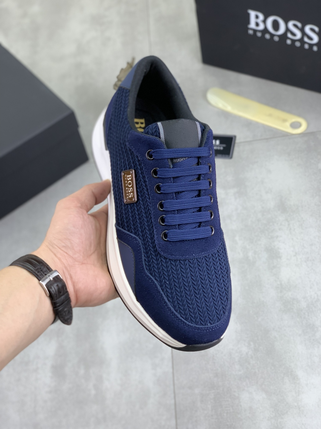 This shoes is AAAAA 1:1 quality (superb). Materials used are identical to the original ones. BOSS trademark marks are indistinguishable to the authentic. Photos take by actual shoes, what you receive will be 100% same with our photos.