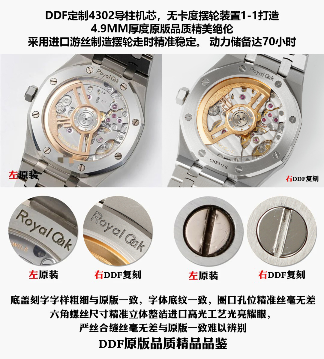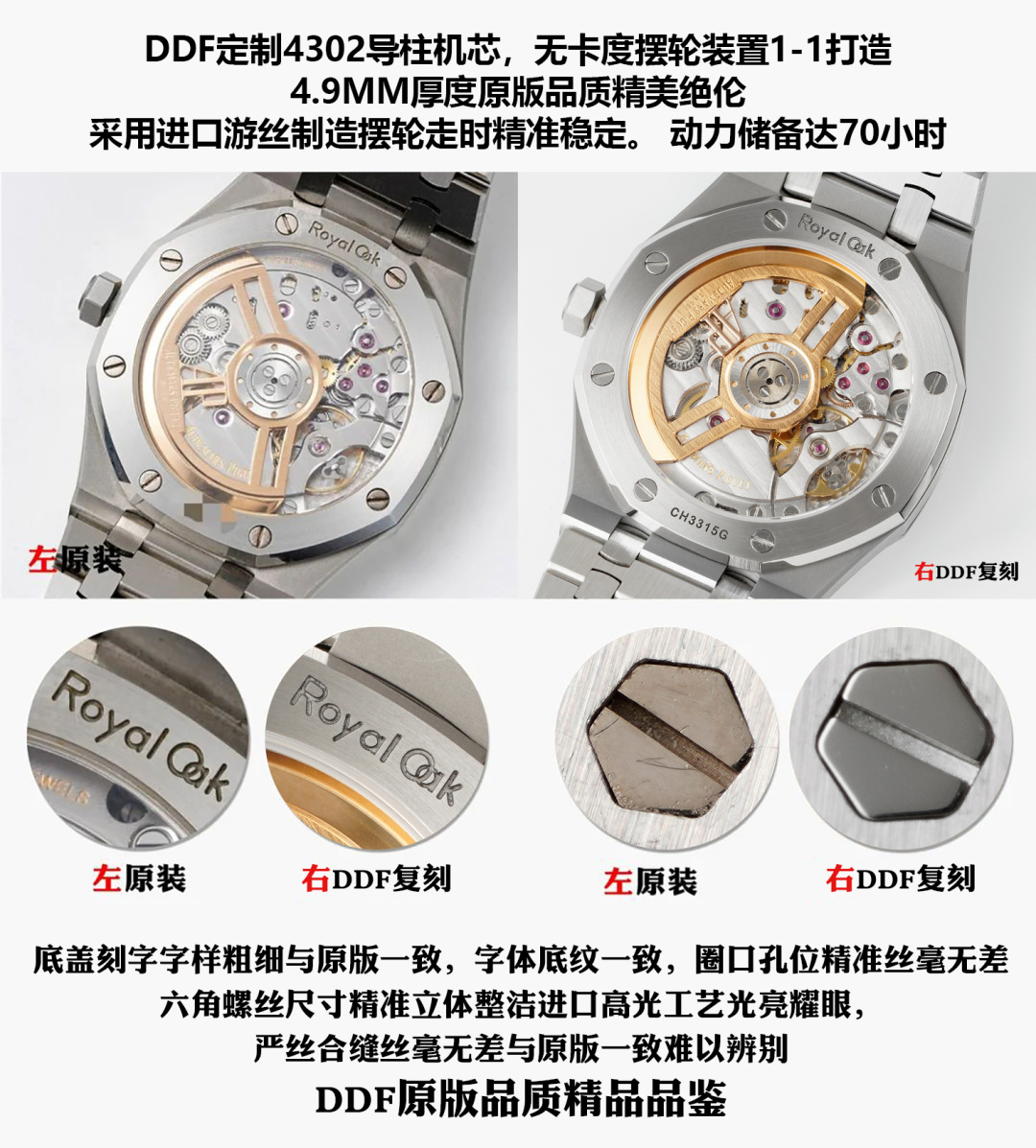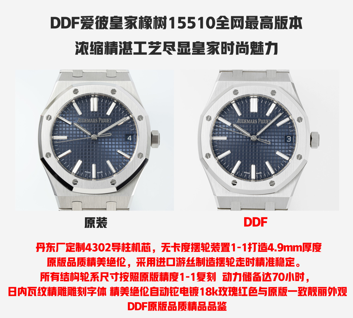 This watches is AAAAA 1:1 quality (superb). Materials used are identical to the original ones. Audemars Piguet trademark marks are indistinguishable to the authentic. Photos take by actual watches, what you receive will be 100% same with our photos.