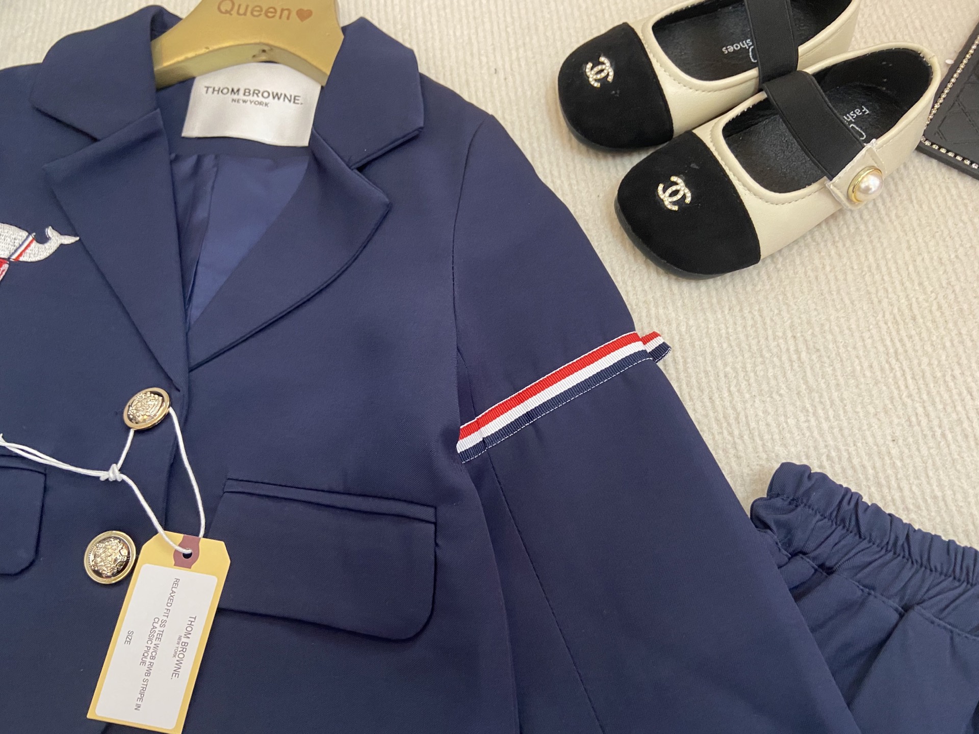 This children's clothes is AAAAA 1:1 quality (superb). Materials used are identical to the original ones. Thom Browne trademark marks are indistinguishable to the authentic. Photos take by actual children's clothes, what you receive will be 100% same with our photos.
