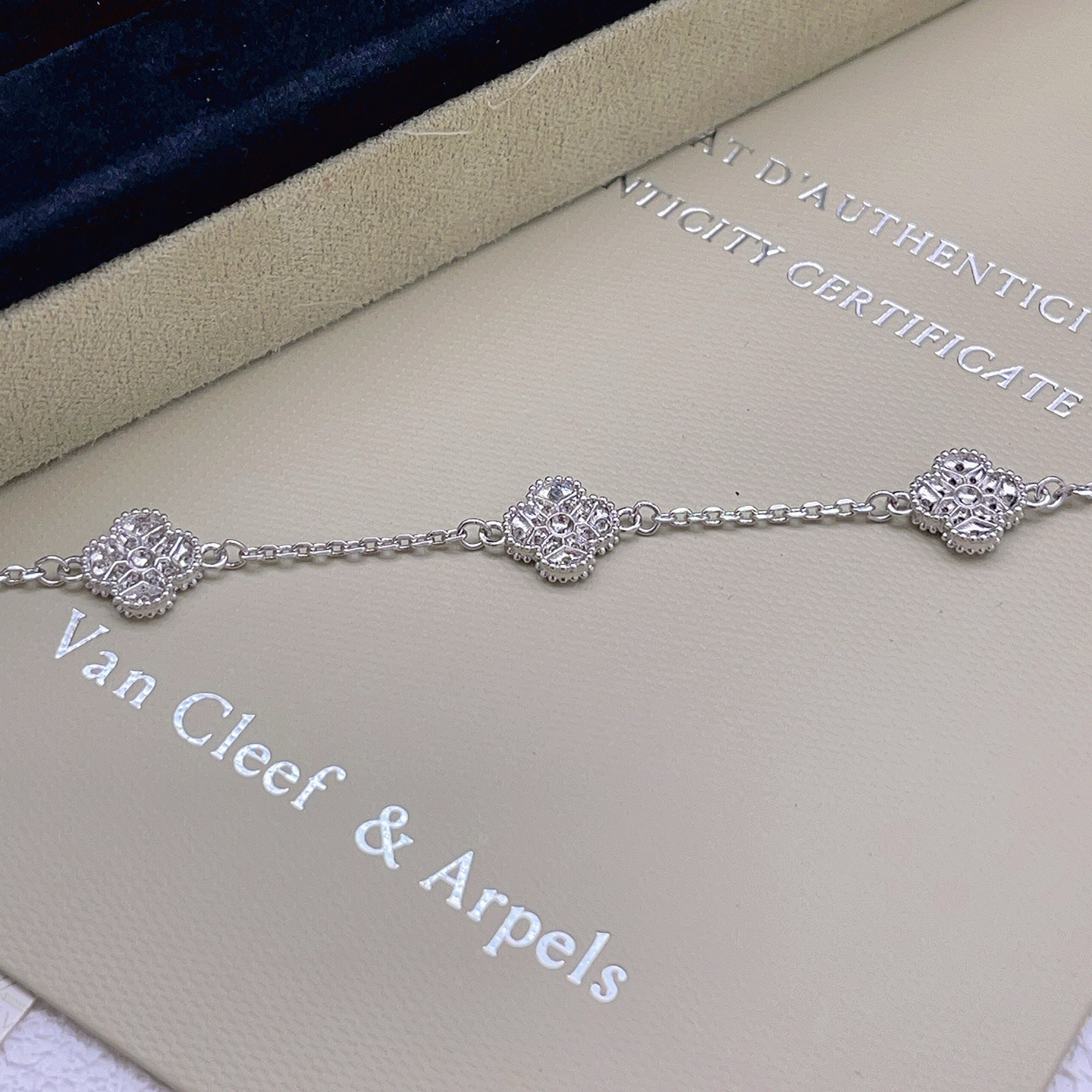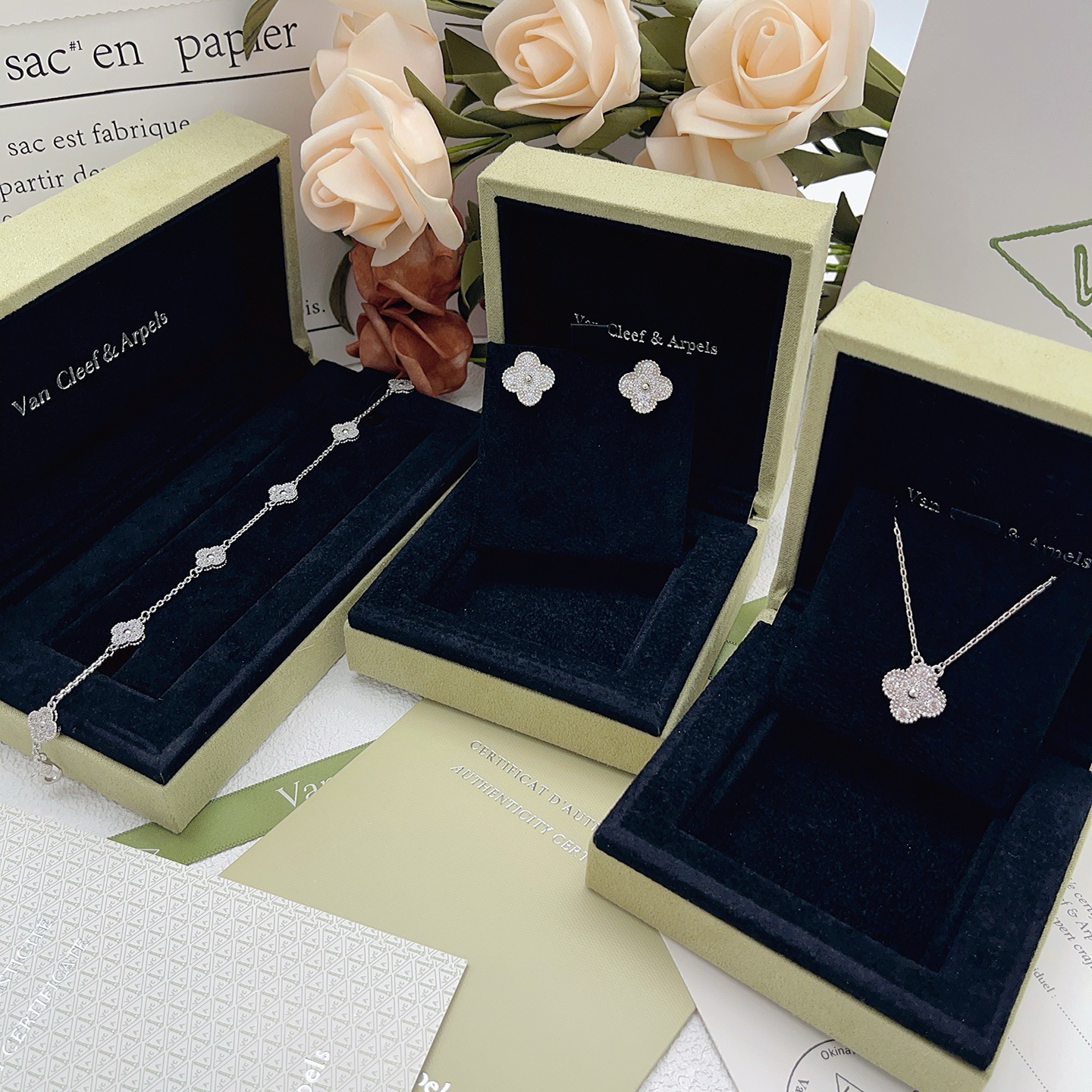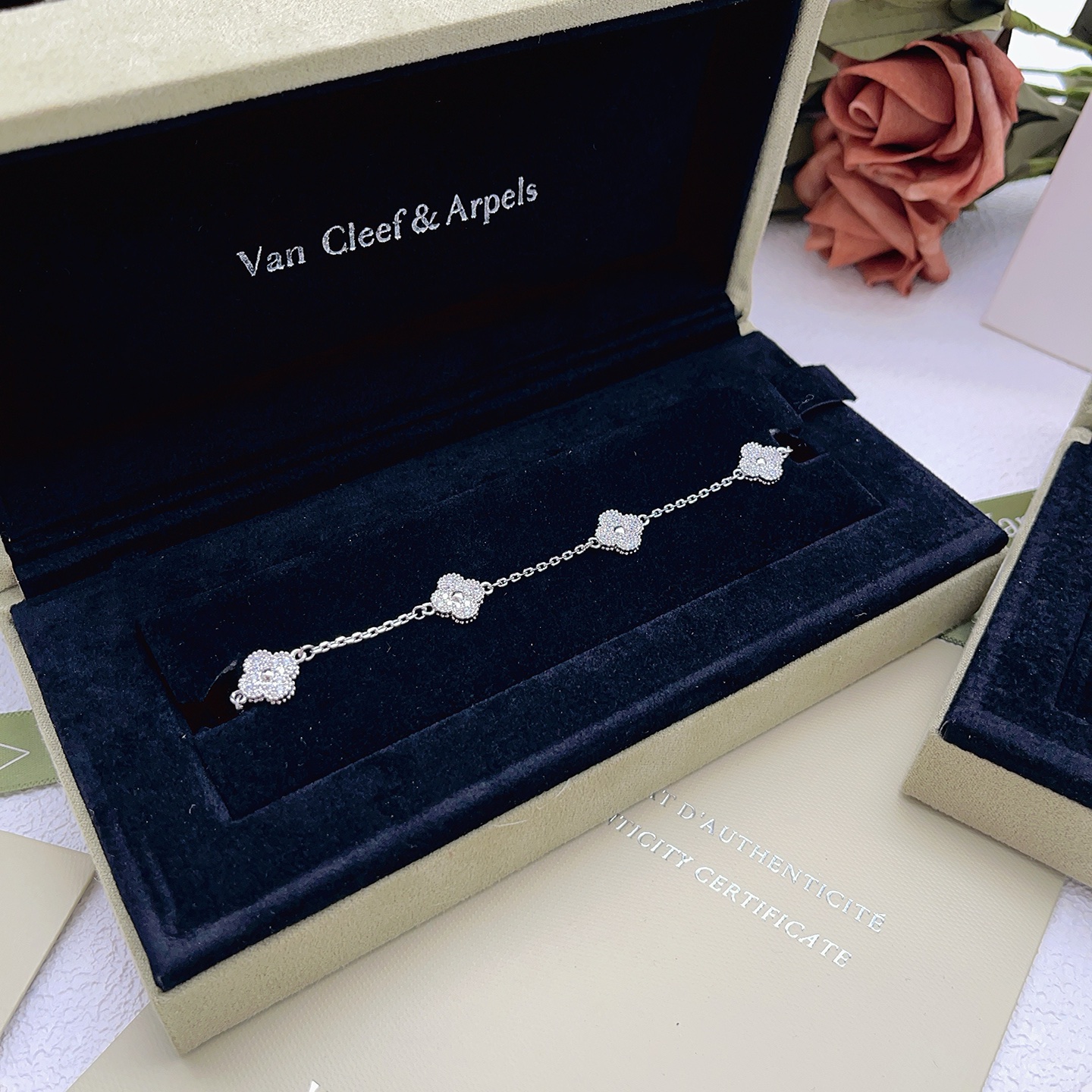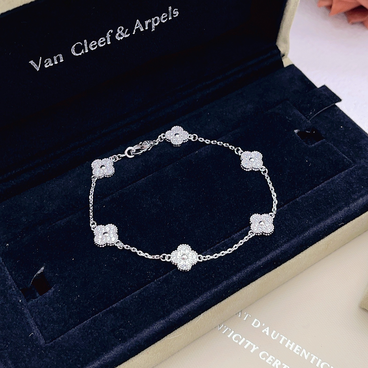 This jewelry is AAAAA 1:1 quality (superb). Materials used are identical to the original ones. Van Cleef & Arpels trademark marks are indistinguishable to the authentic. Photos take by actual jewelry, what you receive will be 100% same with our photos.