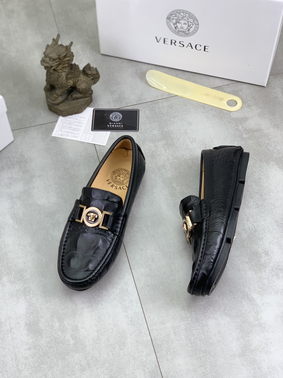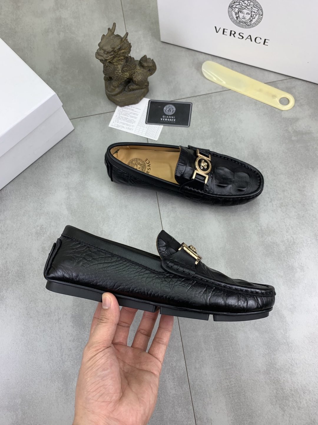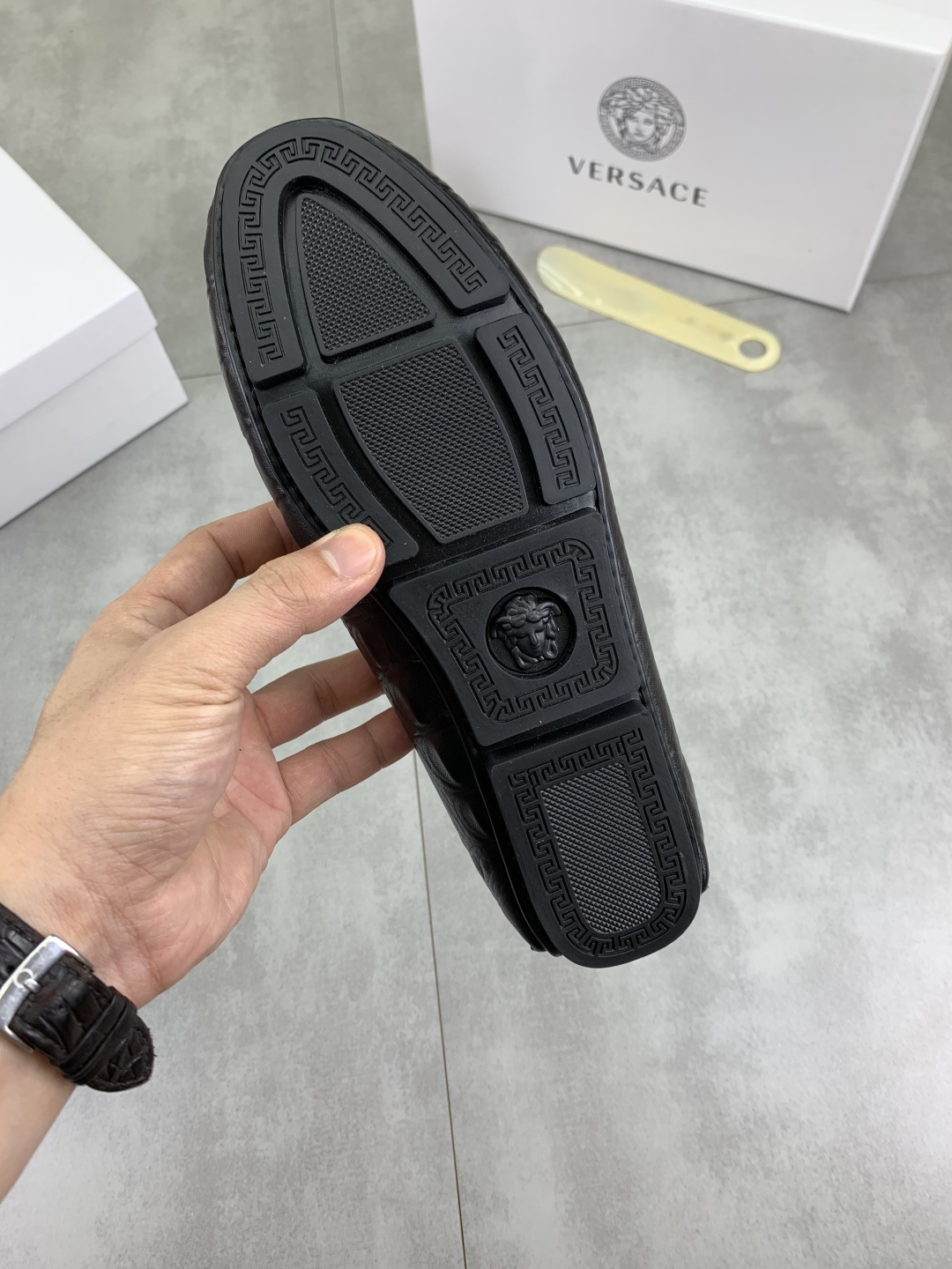 This shoes is AAAAA 1:1 quality (superb). Materials used are identical to the original ones. Versace trademark marks are indistinguishable to the authentic. Photos take by actual shoes, what you receive will be 100% same with our photos.