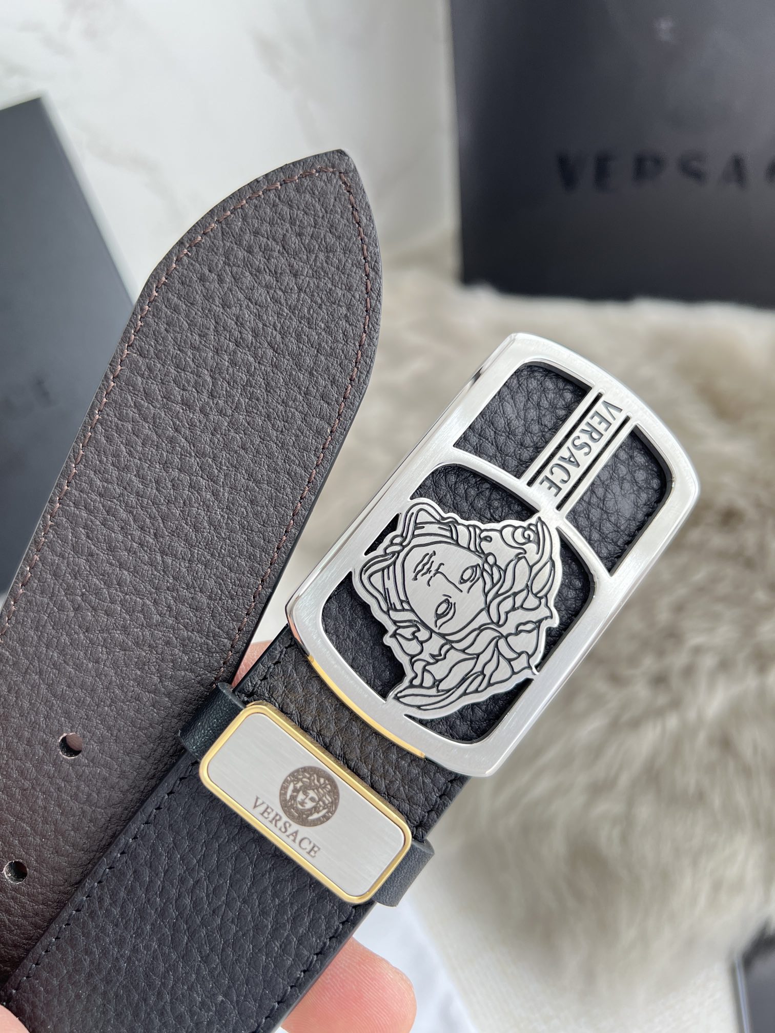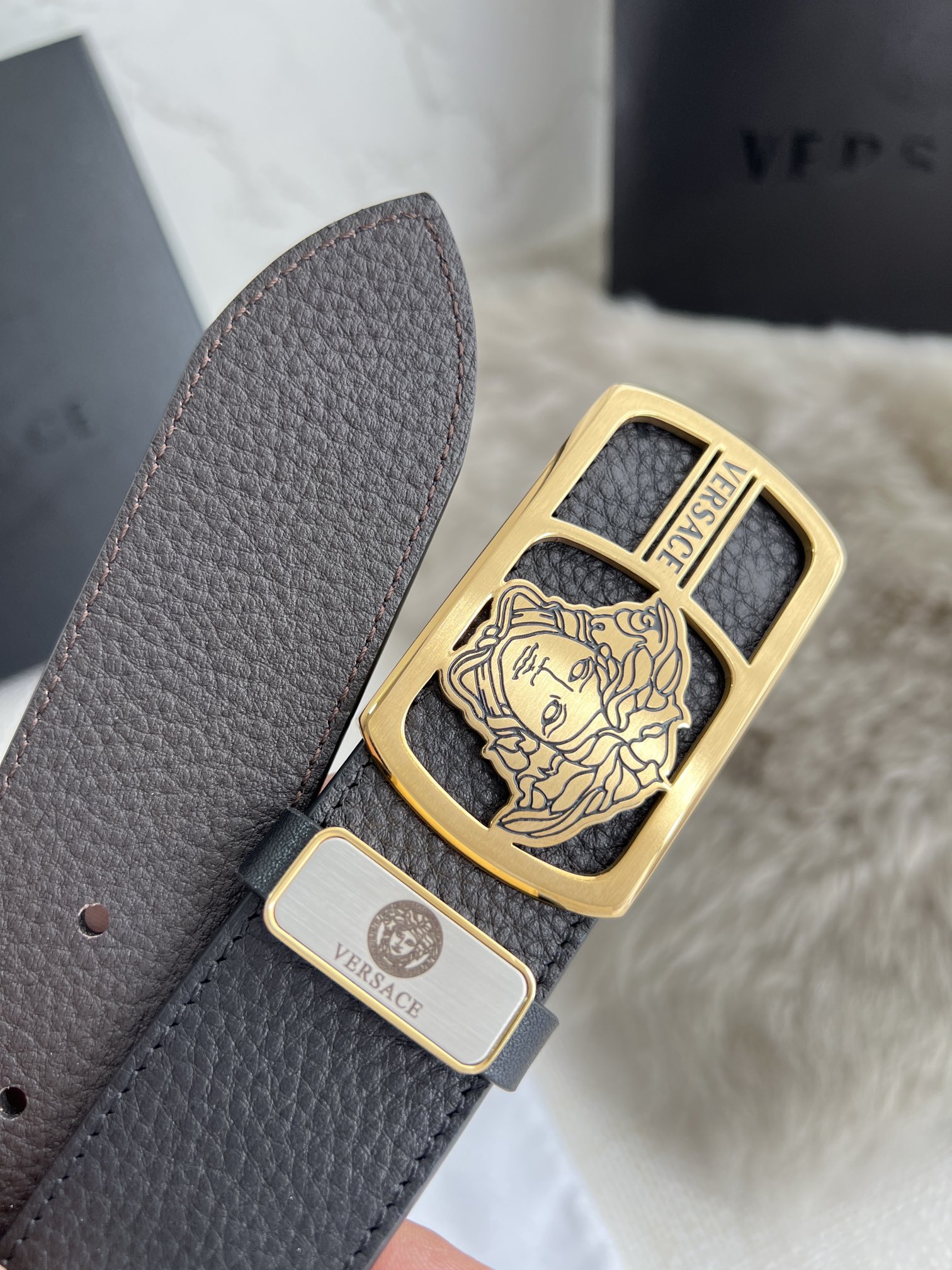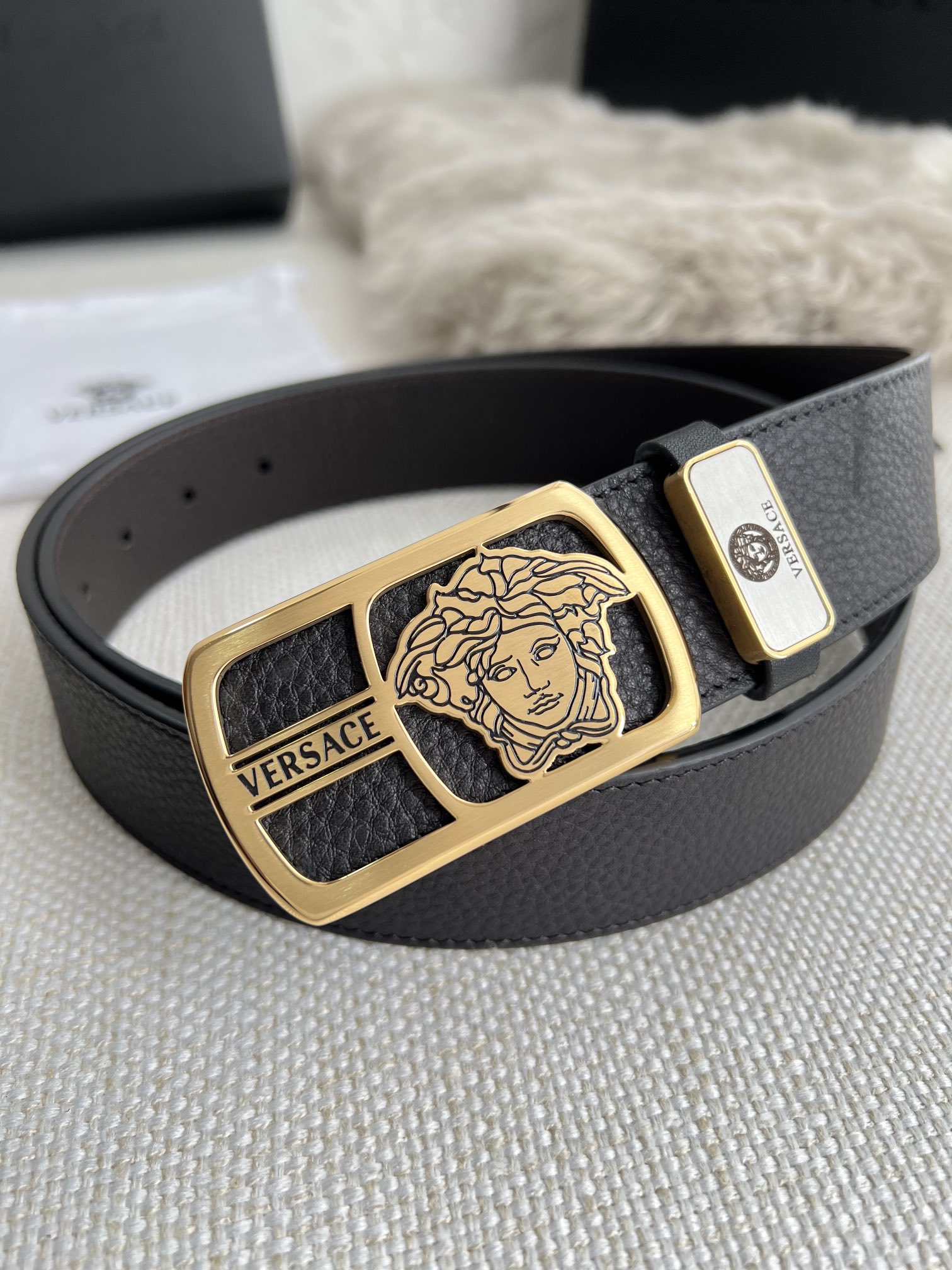 This belt is AAAAA 1:1 quality (superb). Materials used are identical to the original ones. Versace trademark marks are indistinguishable to the authentic. Photos take by actual belt, what you receive will be 100% same with our photos.
