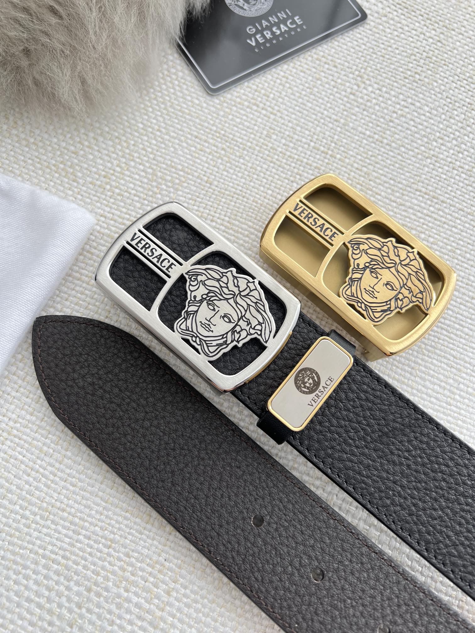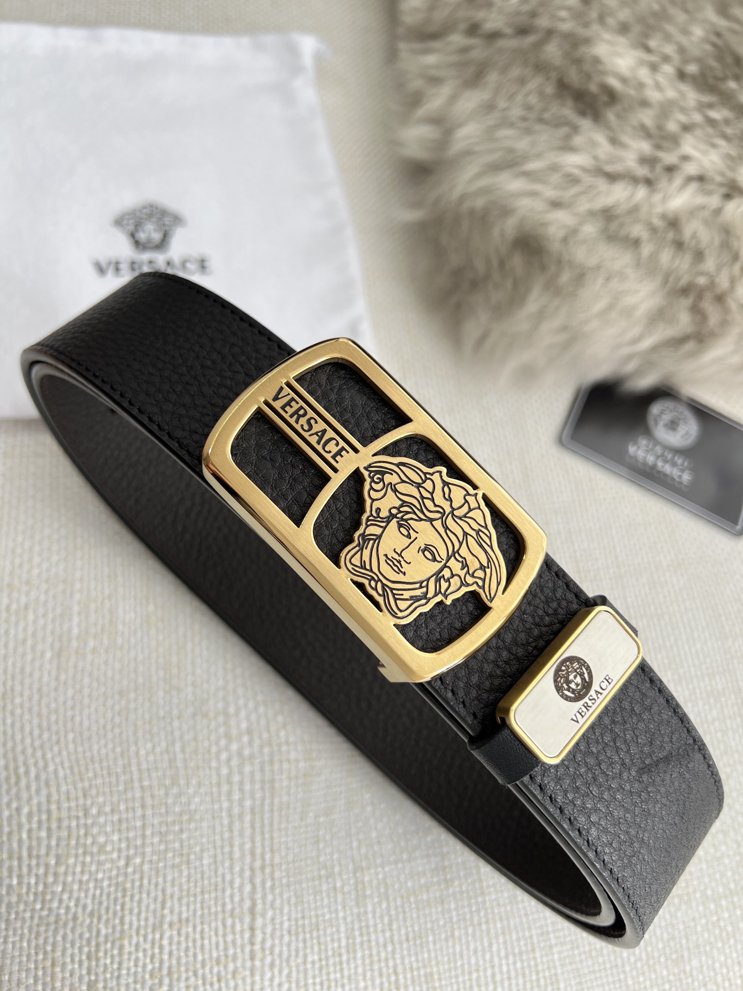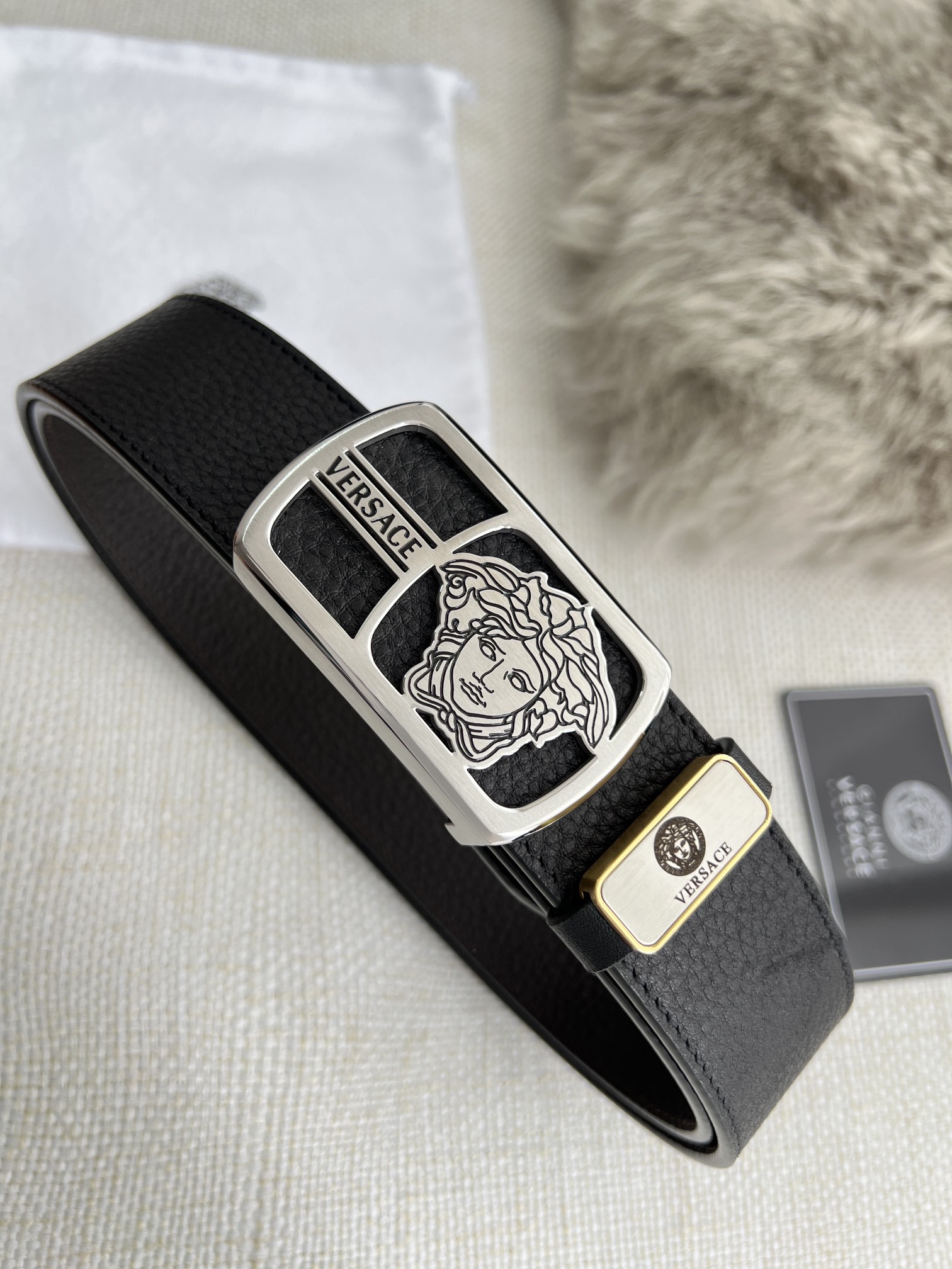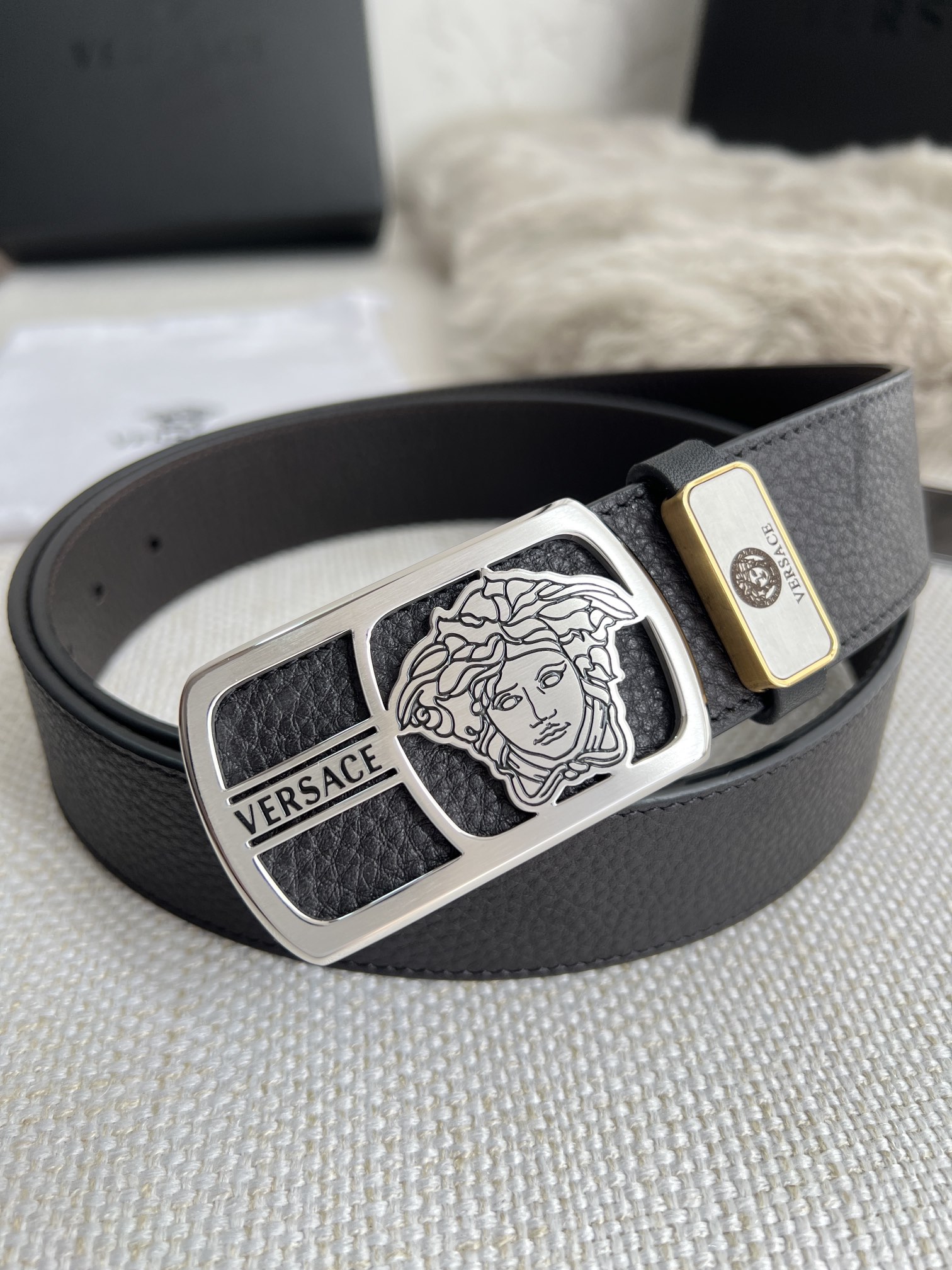 This belt is AAAAA 1:1 quality (superb). Materials used are identical to the original ones. Versace trademark marks are indistinguishable to the authentic. Photos take by actual belt, what you receive will be 100% same with our photos.
