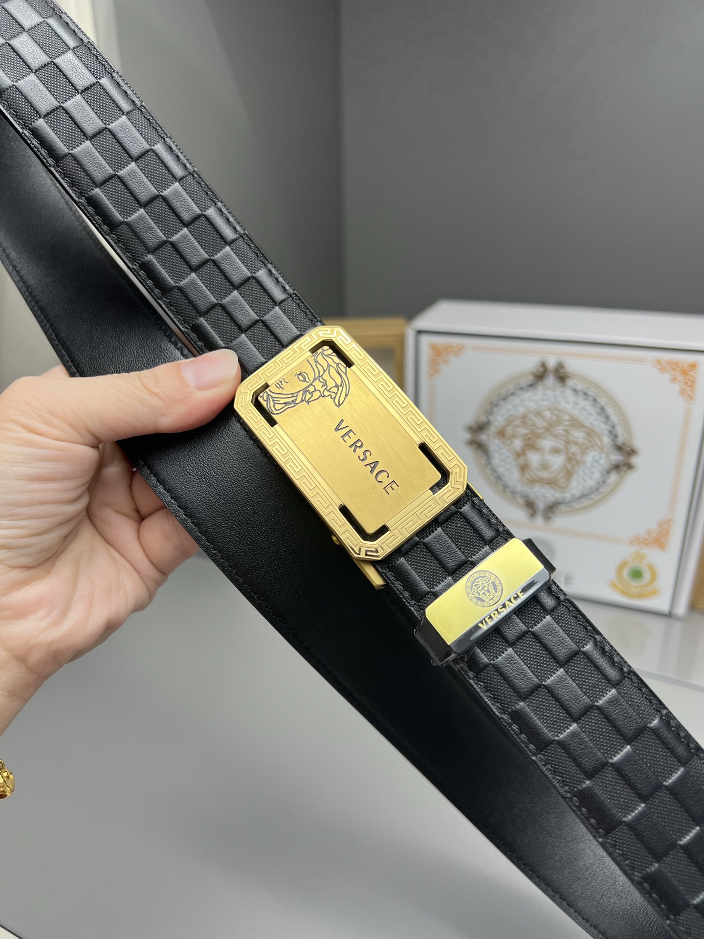 This belt is AAAAA 1:1 quality (superb). Materials used are identical to the original ones. Versace trademark marks are indistinguishable to the authentic. Photos take by actual belt, what you receive will be 100% same with our photos.